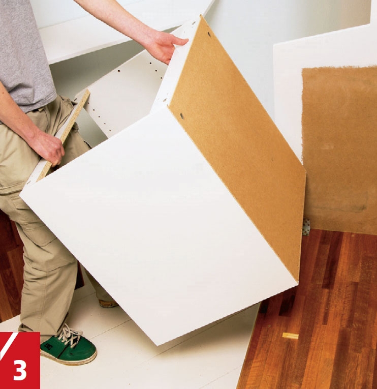 Skapene skal på plass - de vil stå på vinkelbeslagene slik at du må rette dem opp med lister inn mot midten. Skru så skapene fast til baren med et par 4 x 30 mm skruer gjennom skapsidene og skapbunnen.