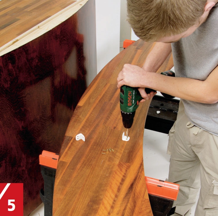 Møbelvinklene monteres på bardisk når du, ved å legge den på plass, har funnet ut og tegnet inn hvor de skal være. Til det brukes 4 x 20 mm skruer. Fest plata til sidene av baren og fronten med 3,5 x 16 mm skruer.