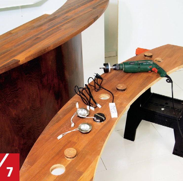 Bor tre hull i lysbaldakinen slik at de passer til halogenspottene. Til det bruker du ei hull-sag. Sett så lampene på plass, fest ledningene med ledningsholdere, og skru fast transfor-matoren til baldakinen.