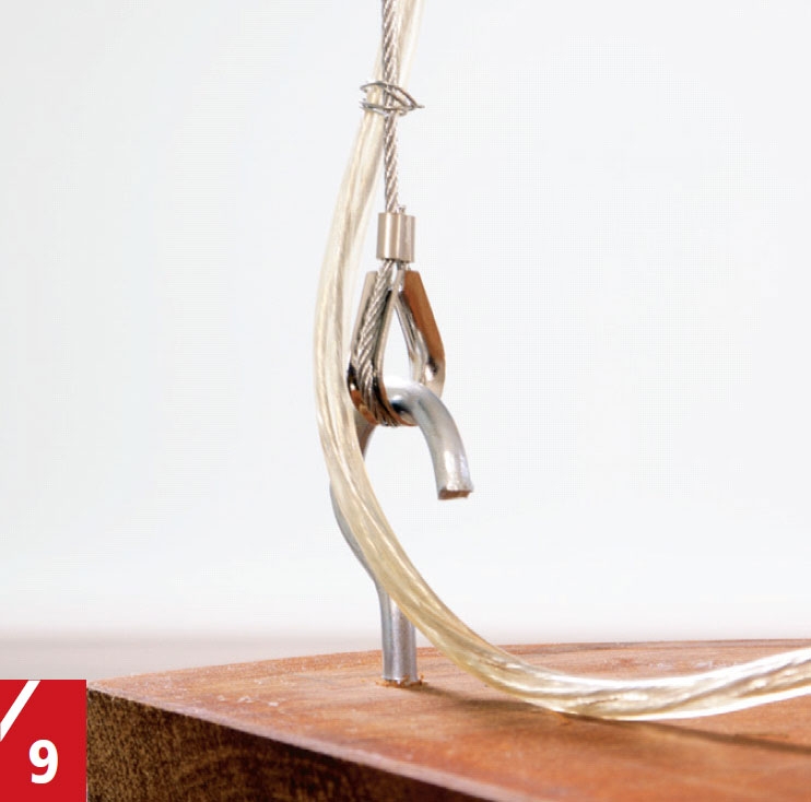 De bakerste krokene til opphenget skrus fast et par cm inne på plata. De to fremste plasserer du cirka 30 cm fra endene for å skape balanse. Stram stålvaierene rundt kausene (ringene), og fest dem med vaierlås.