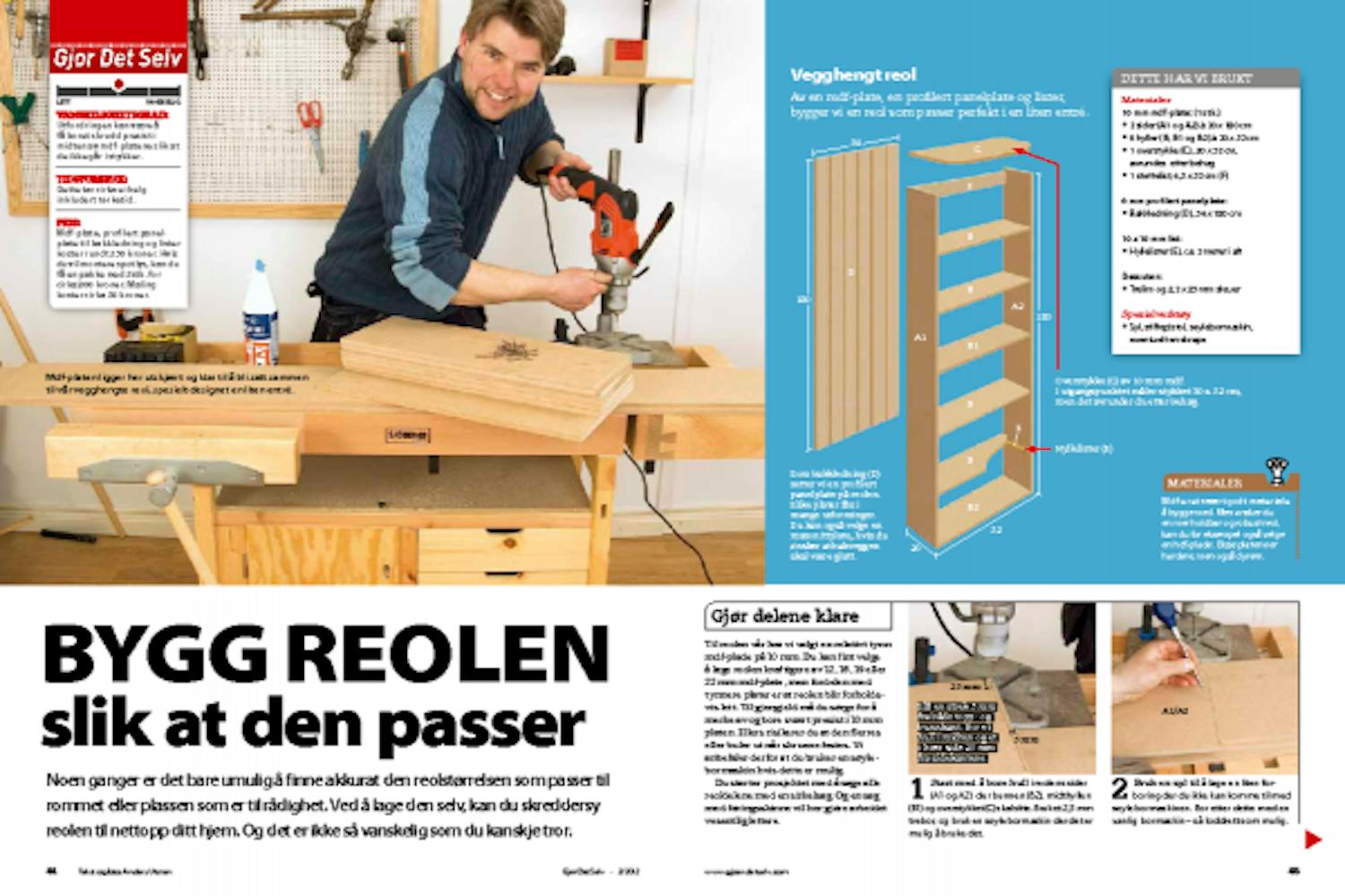 Når limet er tørt, kan du legge på hyllene. Vi har valgt å lage en reol med to løse hyller (B) på hver side av den faste midthyllen (B1), men antall og plassering av hyller bestemmer du helt selv.