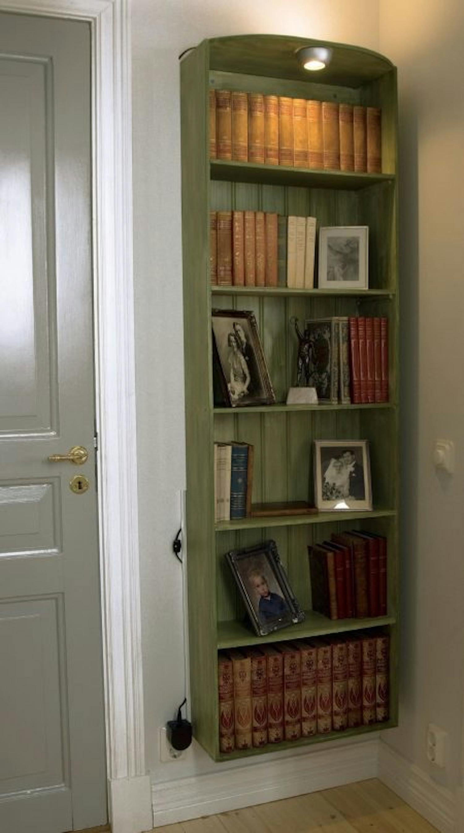 Små entreer som vår, kan ofte være litt dunkelt belyst, siden det sjelden er større vinduer i denne typen rom. Vi slår derfor to fluer i en smekk og monterer spotlys på reolen, både for å lyse opp bøkene og for å få mer lys i rommet.
