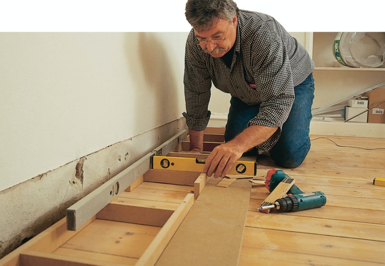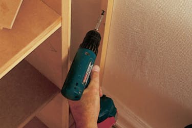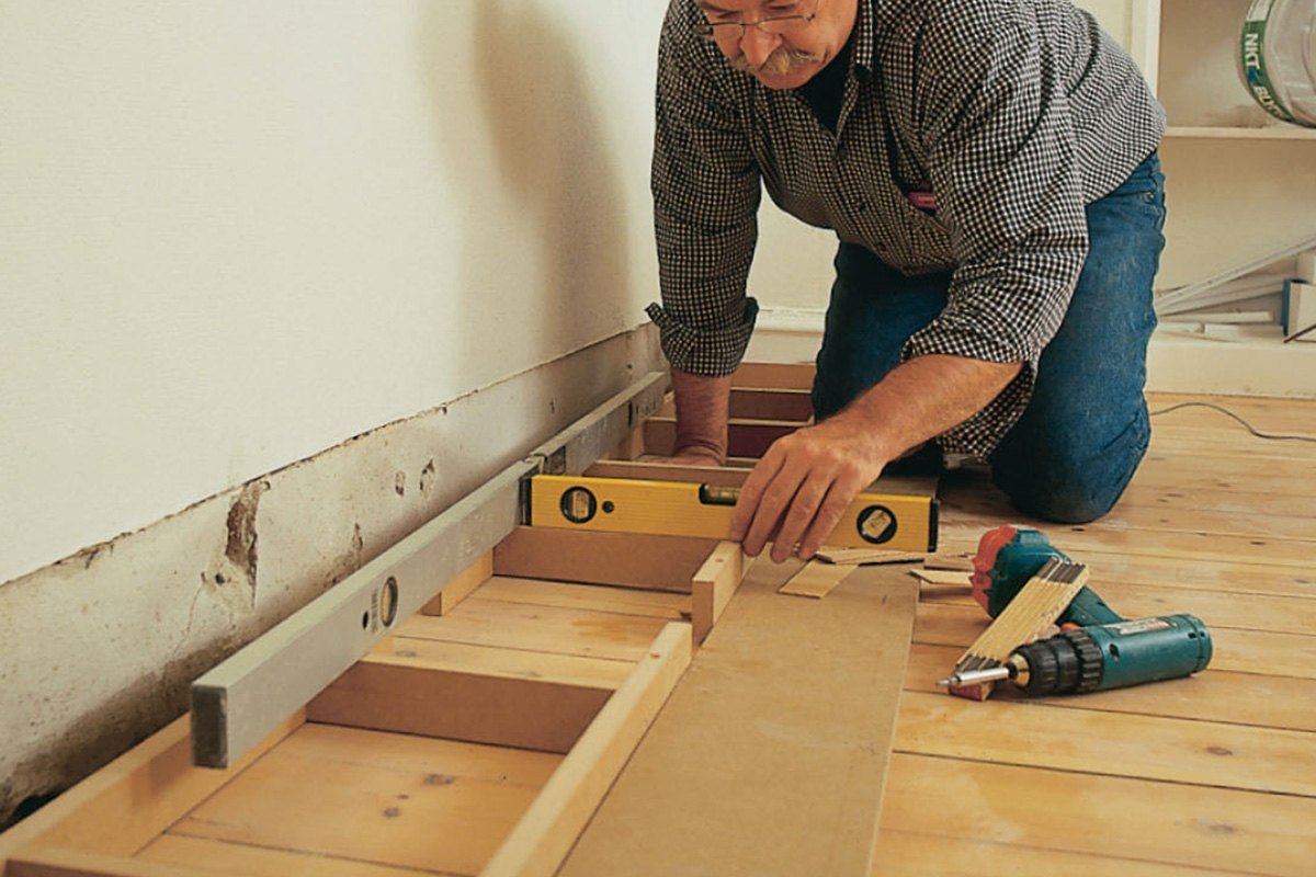 Sokkelen legges ut på gulvet slik at den er i vater. Er gulvet skjevt, rettes sokkelen opp med små biter av trefiberplate. Før sokkelen festes til gulvet med 4 x 80 mm skruer (husk forboring og forsenking), justeres den slik at den passer til bredden av rommet.