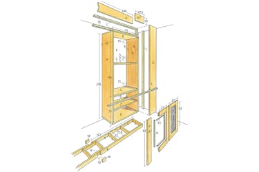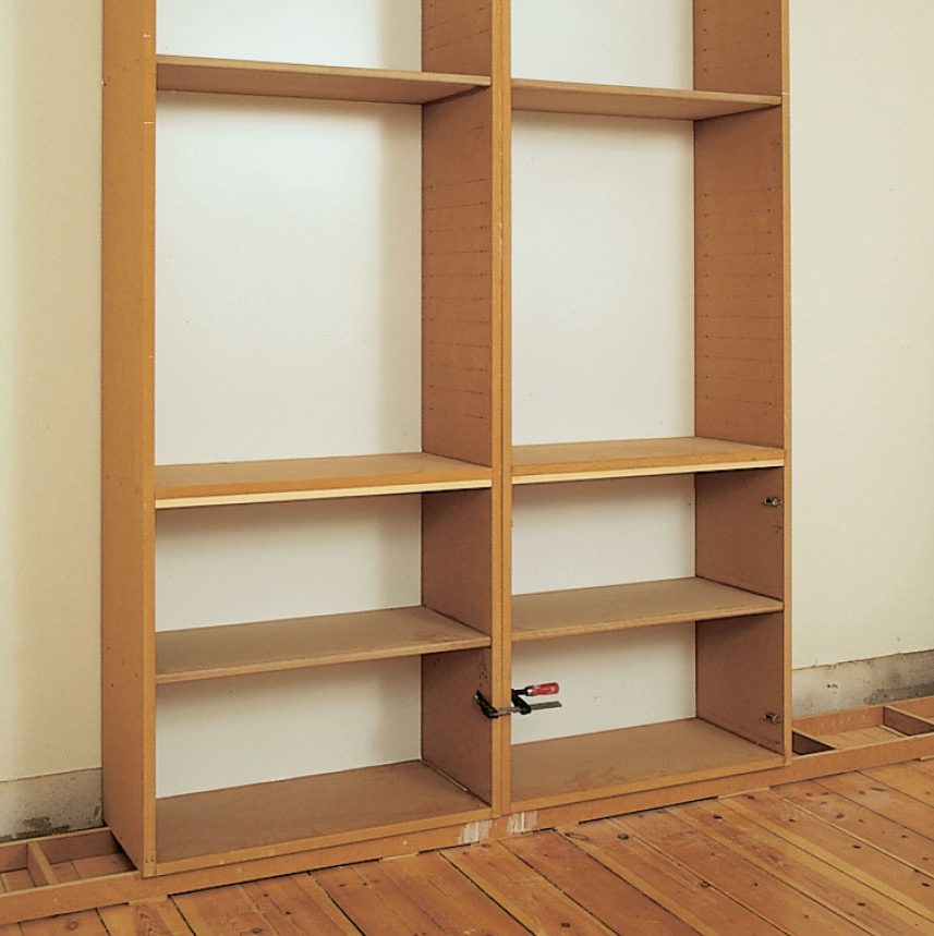 For å skjule den uunngåelige skjøten mellom de enkelte module-\ne - og for å slippe å skulle spark-le overgangen - monterte vi ei pro-\fillist som tilsvarer bredden på si-\dene på de to modulene. På samme måte har vi brukt skjulte hengsler med 90 graders åpning til dørene slik at disse kan sitte helt tett inn-til hylla.