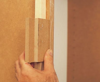 Inndekningen skal flukte nøyaktig med framkanten på hylla. Lag en spesialkloss oppmerkingen, og fest lista nøyaktig langs oppmerkingen.