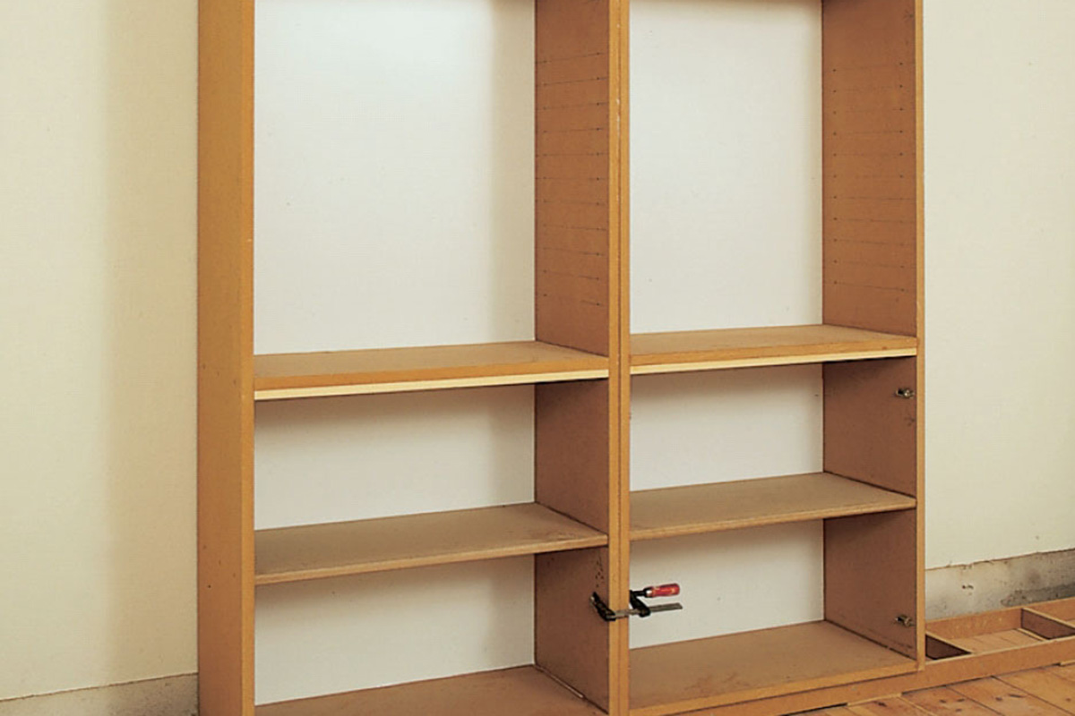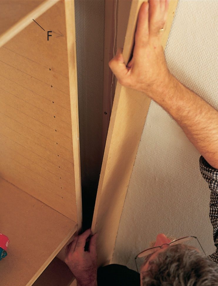 Hylla er nå satt sammen, og skjøtene i inndekningen og skruene sparklet med formtre (woodfiller). Legg mer-ke til hvordan den gjennomgående lista (F) som er festet i framkanten av den faste hylla (C), utgjør bunnen i hylla.