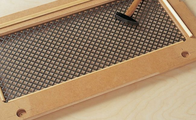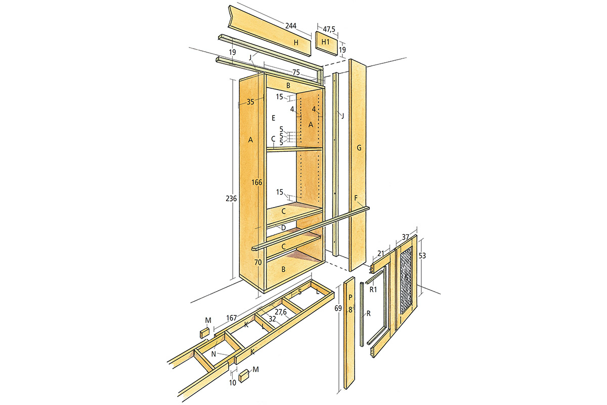 Dørene er laget av 22 mm mdf-plate som er saget i stykker (P + Q) på 8 centimeter. Disse settes sammen til rammer med lim og to 8 x 30 mm treplugger i hvert hjørne (se målene på tegningen).