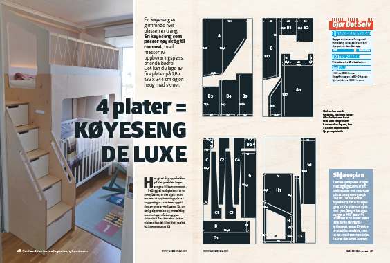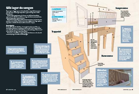 Etterpå kan sengerammen senkes ned i bunnrammen, der den skrus fast med skruer fra innsiden. Til slutt er det rike muligheter for å lage oppbevaring i form av skuffer eller kasser mellom trinnene i trappen.