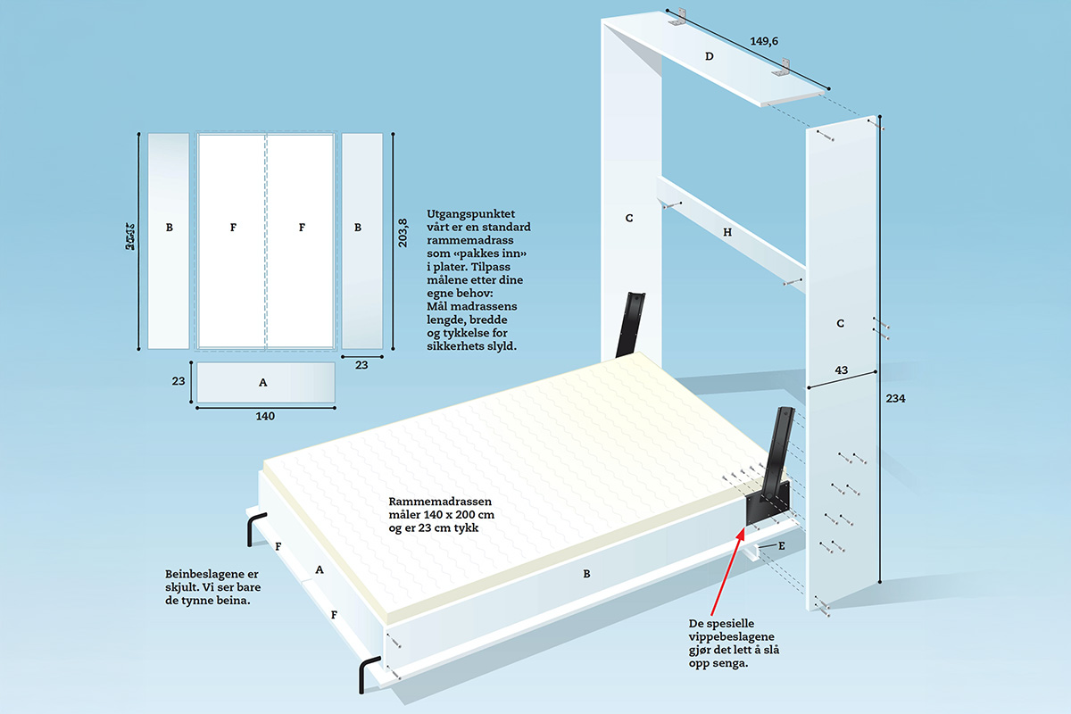 Når rammemadrassen har fått sider, skal du måle bredden fra utsiden av det dreibare beslaget på den ene siden til utsiden av det tilsvarende beslaget på den andre siden. Er målet for eksempel 149,6 cm har du skapets innvendige bredde. Kontrollér bredden før du sager til topplata, bunnen og midtbordet på mål og skrur dem sammen med de loddrette platene. Den innvendige bredden på skapet må nemlig være nøyaktig fordi rammemadrassen skal hektes opp i skapsidene. Det er mal til markering av åtte skruehull på hver skapside til dreiebeslaget. Høyden på skapet tilsvarer lengden på madrassen inkludert mdf-kledning og bein.
