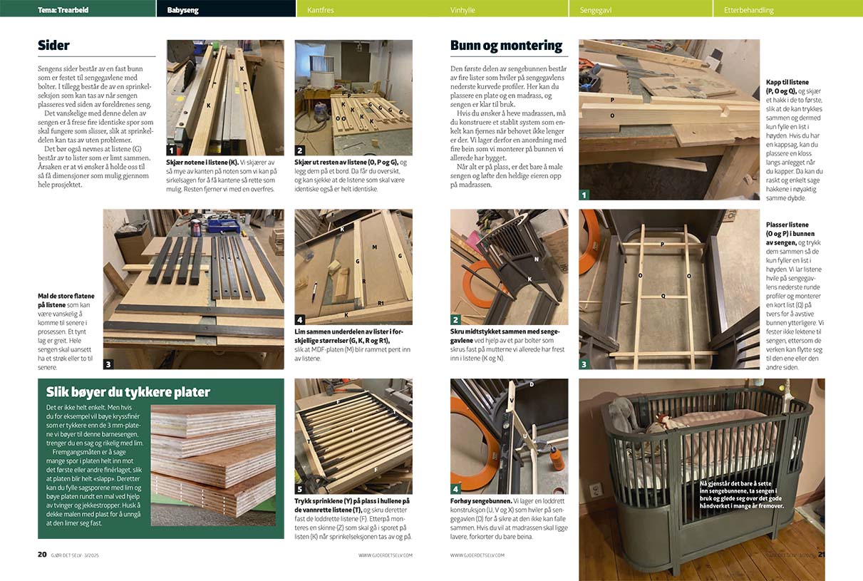 Sett sammen toppen av sengegavlen, og trykk sprinklene (Y) fast i de runde profilene (C). Lim deretter sammen hele sengegavlen slik at den bøyde kryssfineren (E) og delen med sprinklene festes av rundingene (B, C og D). Vi bruker rikelig med trelim og mange tvinger.