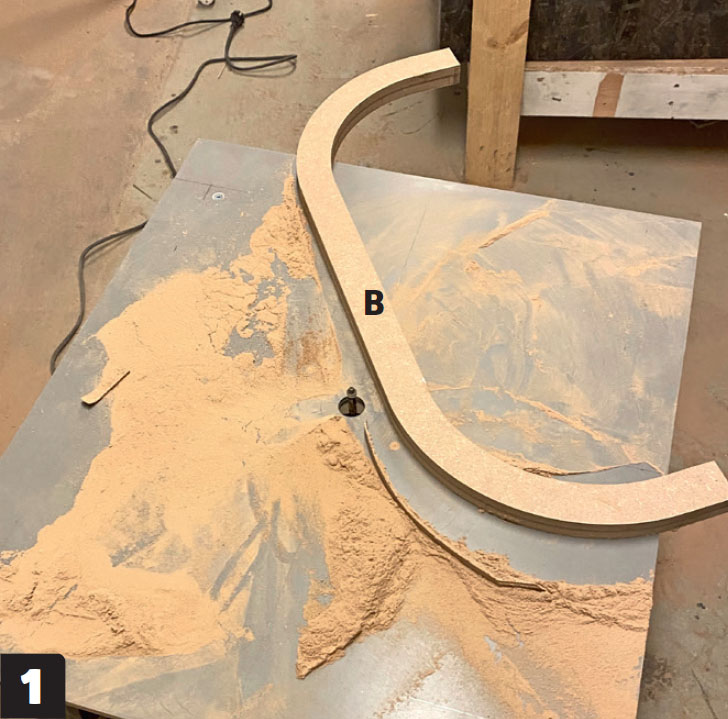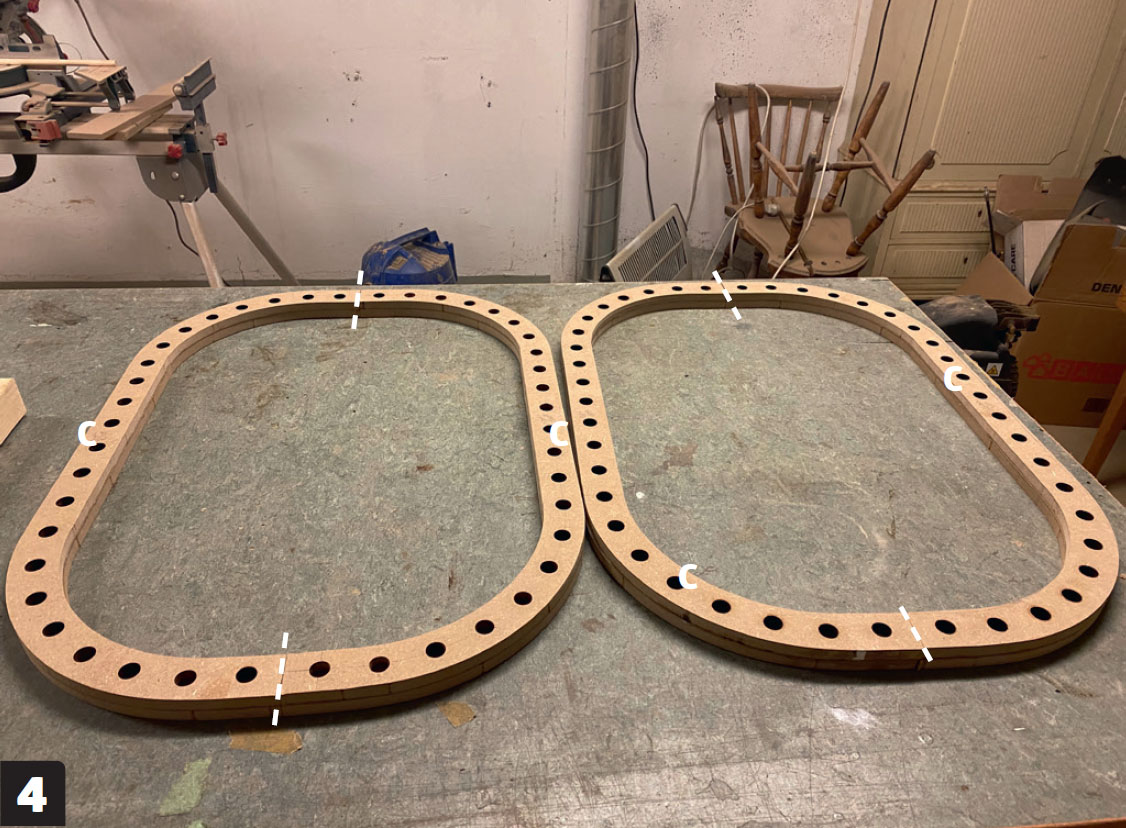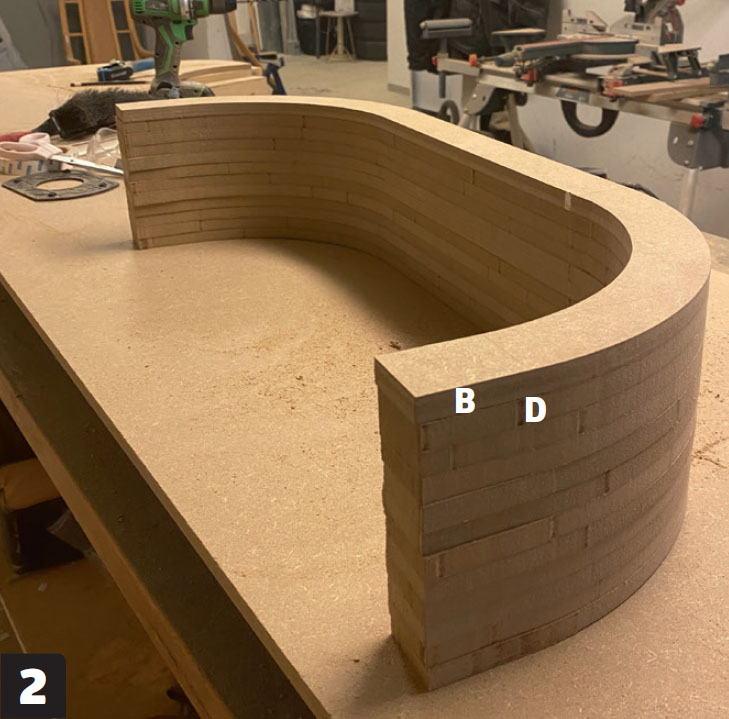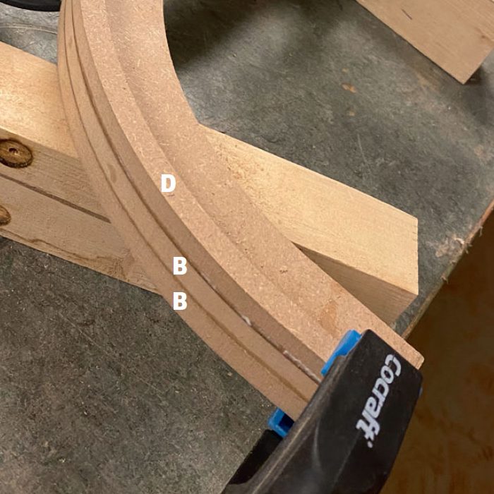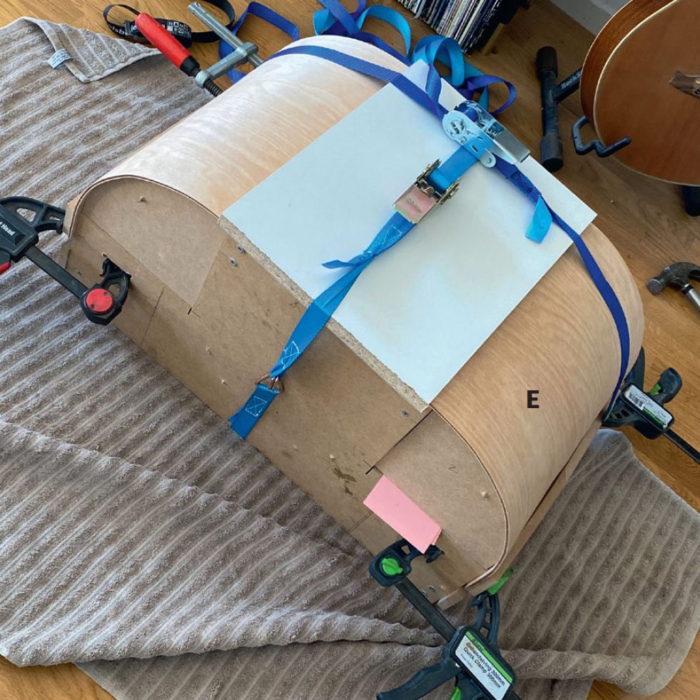 Lag en mal av MDF, og lim sammen to plater av 3 mm kryssfinér (E) med trelim. Når platene sitter som de skal, spennes de fast til malen på kryss og tvers, slik at hele platen får en jevn bøy. Vi bruker en kombinasjon av jekkestropper og tvinger.