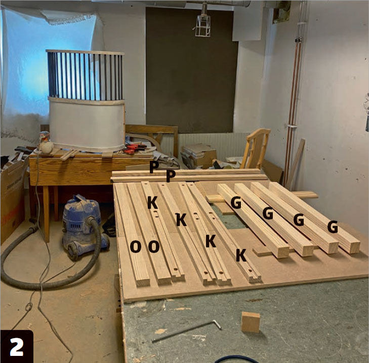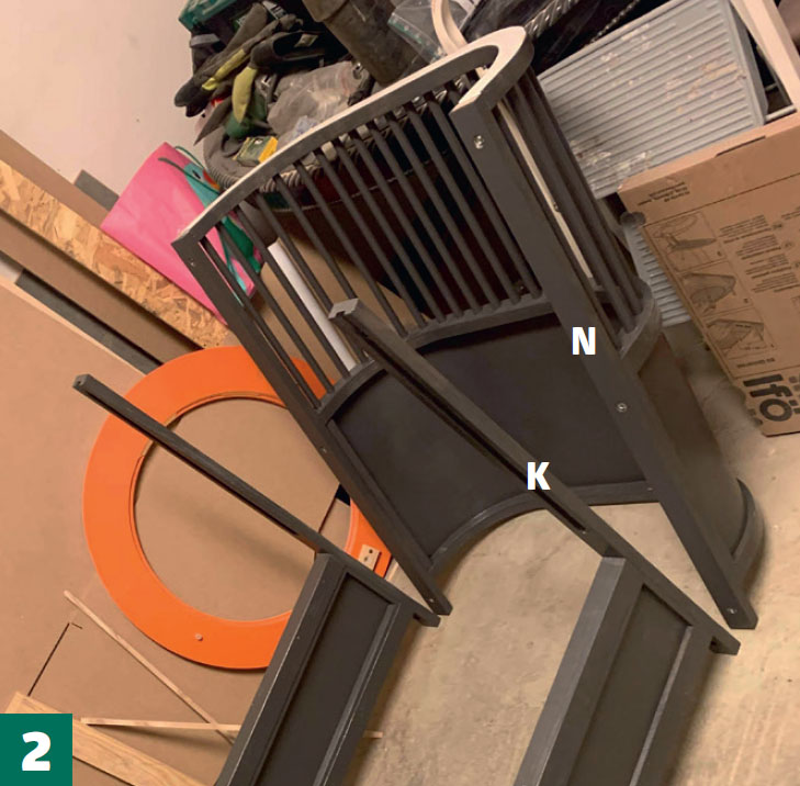 Lim og skru avstivningslistene (N) fast på sengegavlen. Vi undersenker dessuten tre muttere, slik at vi senere kan spenne sengegavlen sammen med listen (K) på den neste seksjonen.