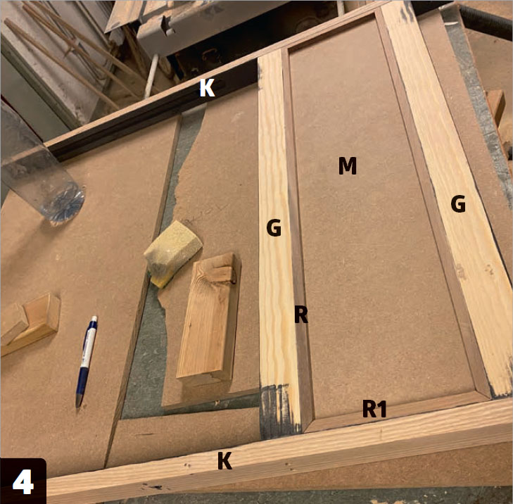 Lim sammen underdelen av lister i forskjellige størrelser (G, K, R og R1), slik at MDF-platen (M) blir rammet pent inn av listene.