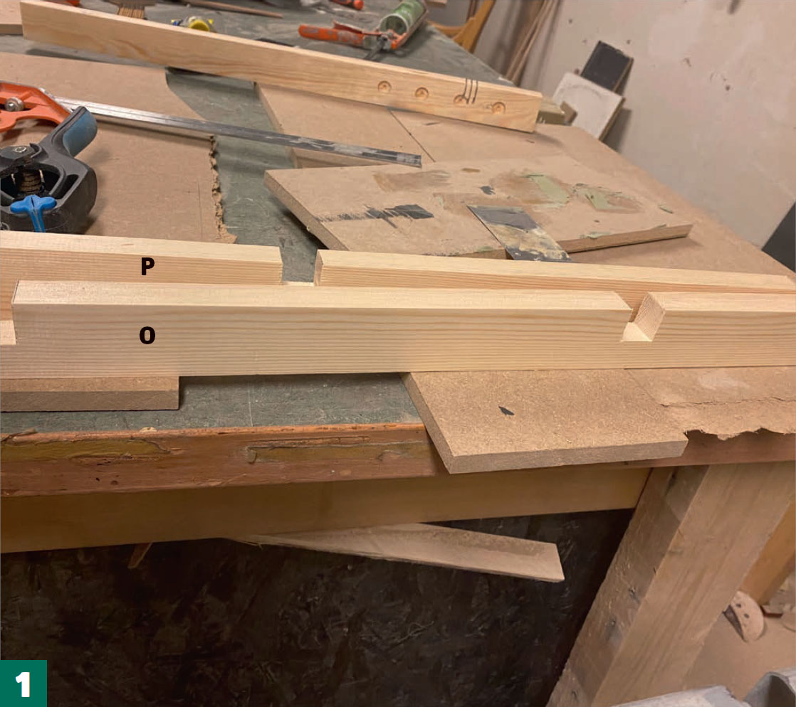 Kapp til listene (P, O og Q), og skjær et hakk i de to første, slik at de kan trykkes sammen og dermed kun fylle en list i høyden. Hvis du har en kappsag, kan du plassere en kloss langs anlegget når du kapper. Da kan du raskt og enkelt sage hakkene i nøyaktig samme dybde.