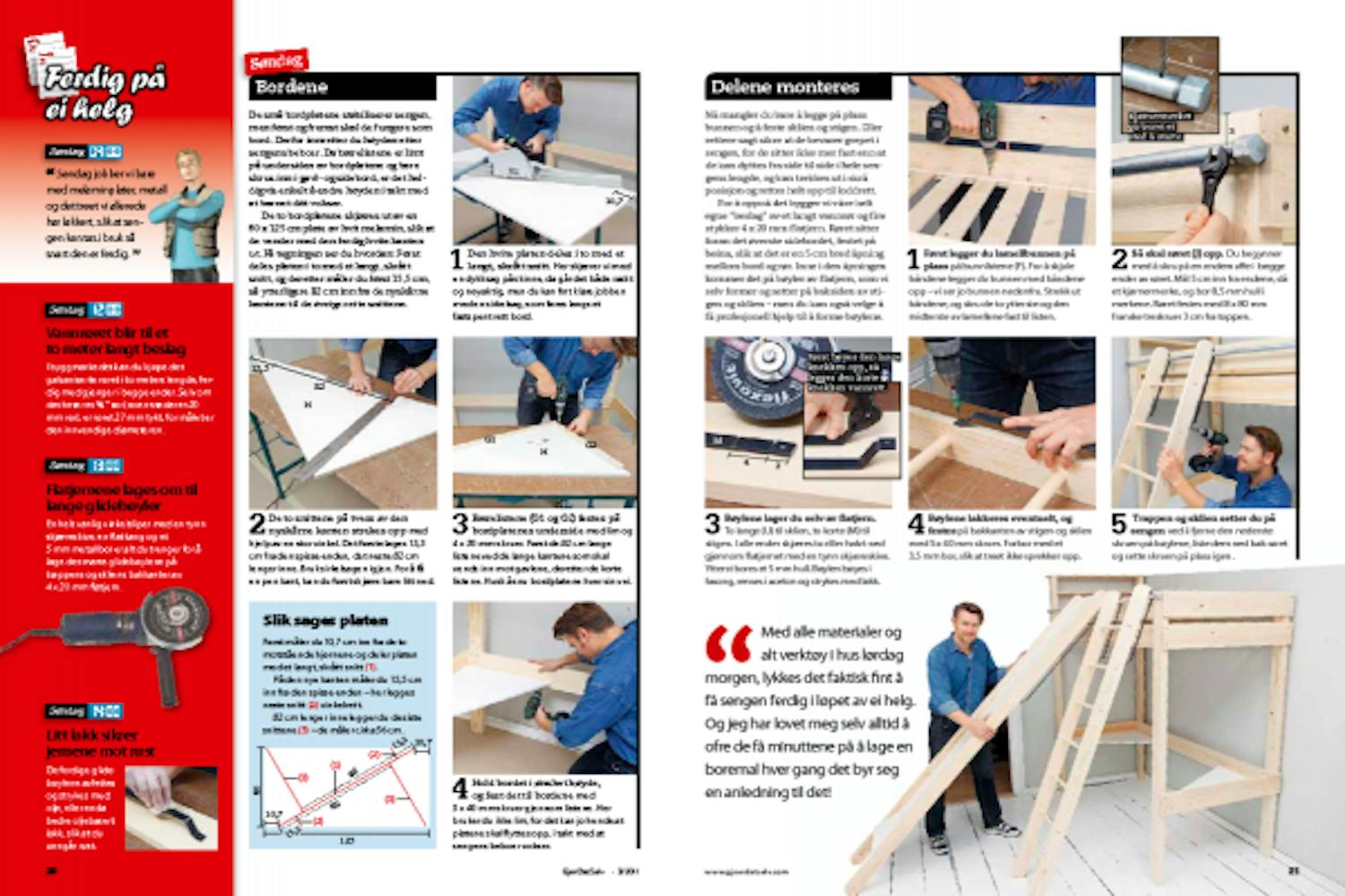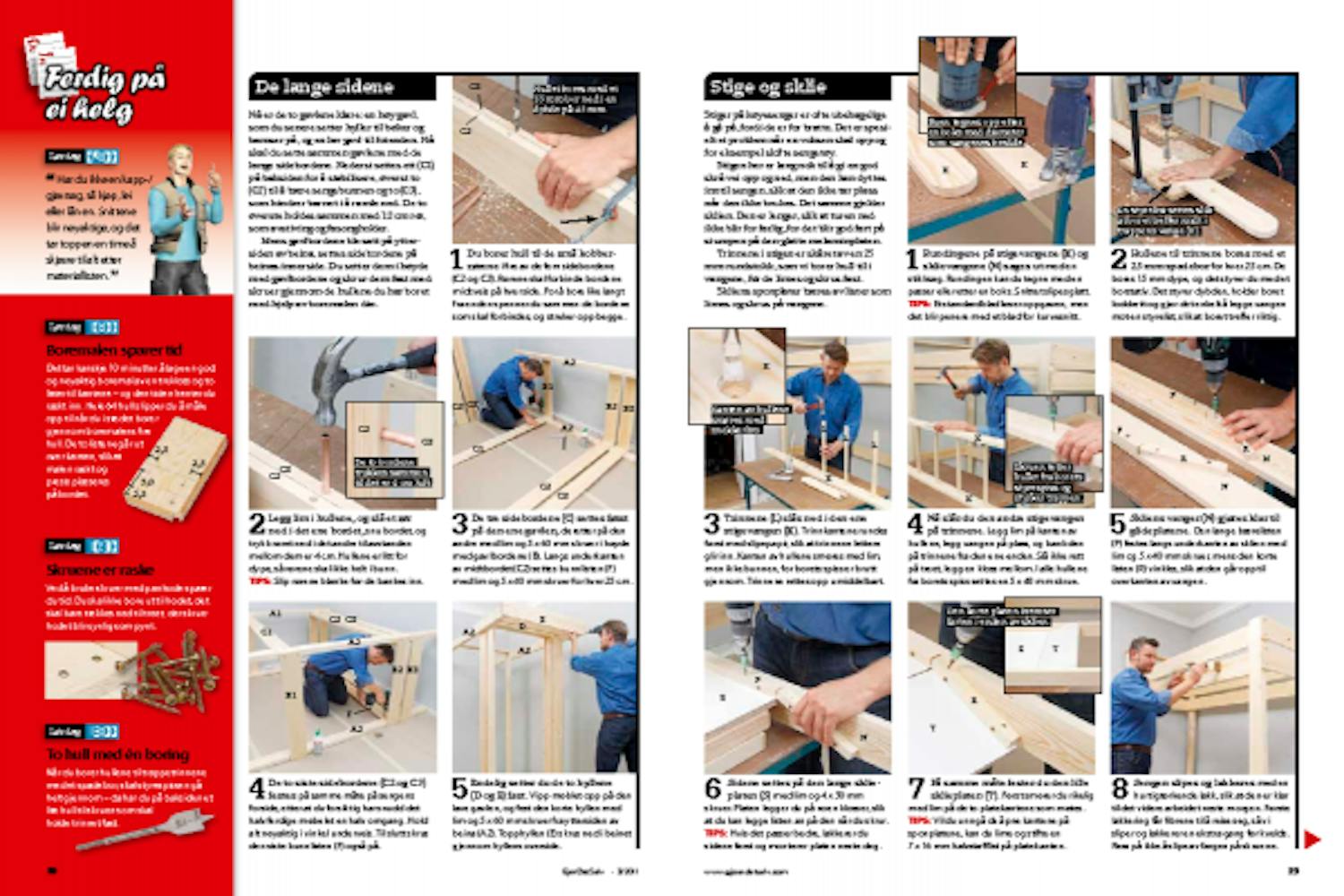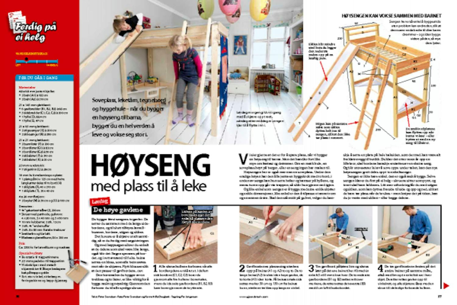 Du bygger først sengens to gavler. De setter du sammen med de lange sidebordene, og til slutt tilføyes lamellbunnen, bordene, stigen og sklien.