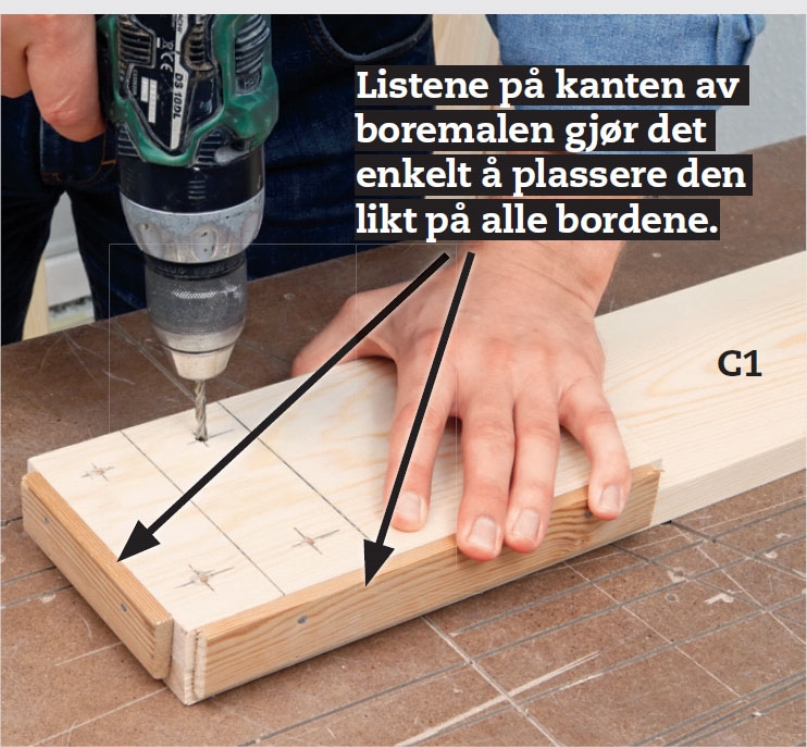 Alle skruehullene forbores når alle bordlengdene er skåret ut. I de fem sidebordene (C1, C2, C3) borer du gjennom alle fire hullene i boremalen, mens du i de seks gavlbordene (B1, B2, B3) bare borer gjennom de to ytterste.