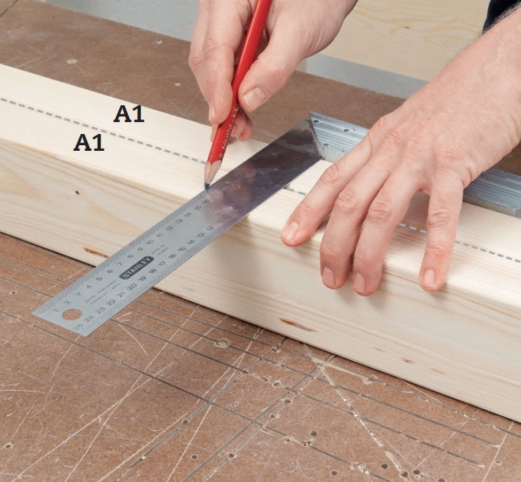 Gavlbordenes plassering strekes opp på beina (A1 og A2) to og to. De to lange beina (A2) brukes i den høye gavlen, de to korte (A1) i den korte. På beinas smale side settes merker 50 cm og 150 cm fra beinas bunn, strekene trekkes opp langs en vinkel.