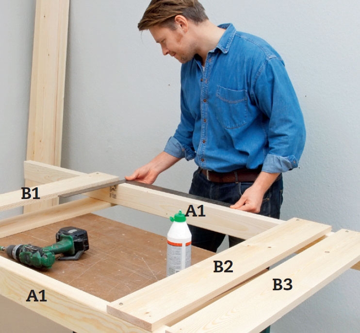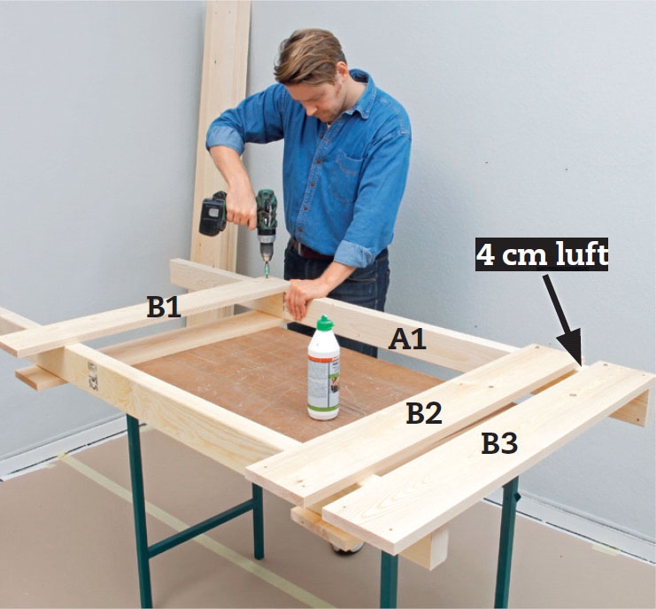 Tre gavlbord påføres lim og skrus løst på det ene beinet (her A1) med én enkelt 5 x 60 mm skrue hver. De to nederste gavlbordene (B1 og B2) settes rett over merkene, deretter settes det øverste (B3) med 4 cm luft til nabobordet.