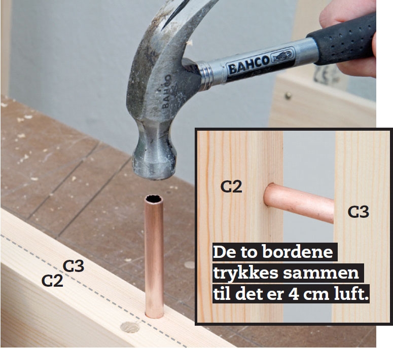 Du borer hull til de små kobberrørene i fire av de fem sidebordene (C2 og C3). Rørene skal forbinde bordene midtveis på hver side. For å bore like langt fra enden spenner du sammen de bordene som skal forbindes, og streker opp begge.