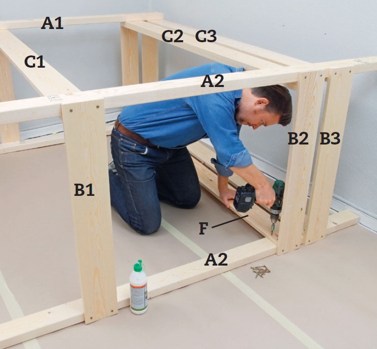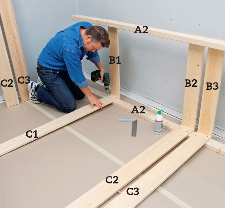 Nå er de to gavlene klare: en høy gavl, som du senere setter hyller til bøker og bamser på, og en lav gavl til fotenden. Nå skal du sette sammen gavlene med de lange sidebordene. Nederst settes ett (C1) på baksiden for å stabilisere, øverst to (C2) til å bære sengebunnen og to (C3), som hindrer barnet i å ramle ned. De to øverste holdes sammen med 12 cm rør, som avstiving og fasongholder.