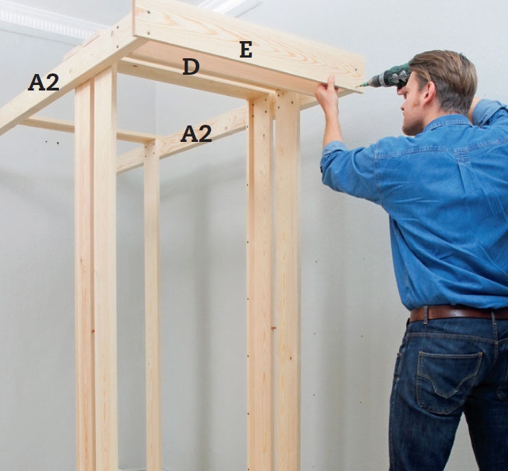 De tre sidebordene (C) settes først på den ene gavlen, deretter på den andre med lim og 5 x 60 mm skruer i høyde med gavlbordene (B). Langs underkanten av midtbordet (C2) settes bunnlisten (F) med lim og 5 x 40 mm skruer for hver 25 cm.