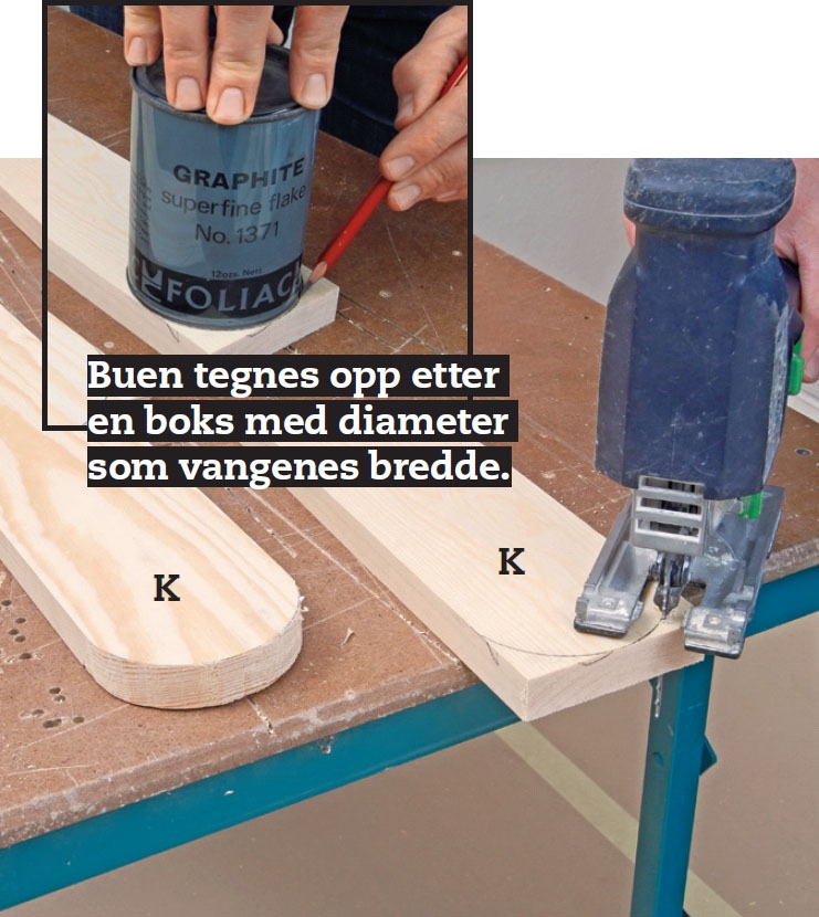 Rundingene på stigevangene (K) og sklievangene (N) sages ut med en stikksag. Rundingen kan du tegne med en passer eller etter en boks. Snittet slipes glatt.