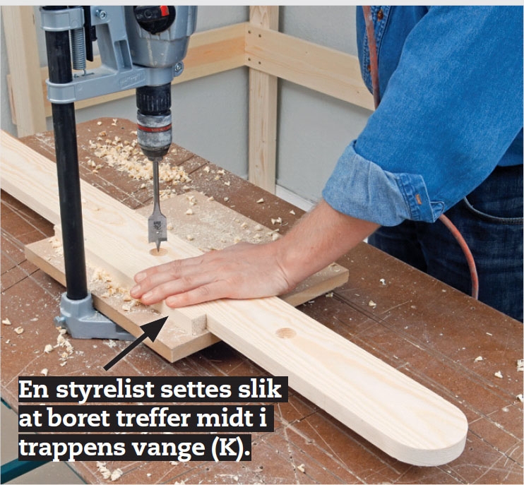 Hullene til trinnene bores med et 25 mm spadebor for hver 25 cm. De bores 15 mm dype, og det styrer du med et borstativ. Det styrer dybden, holder boret loddrett og gjør det enkelt å legge vangen mot en styrelist, slik at boret treffer riktig.