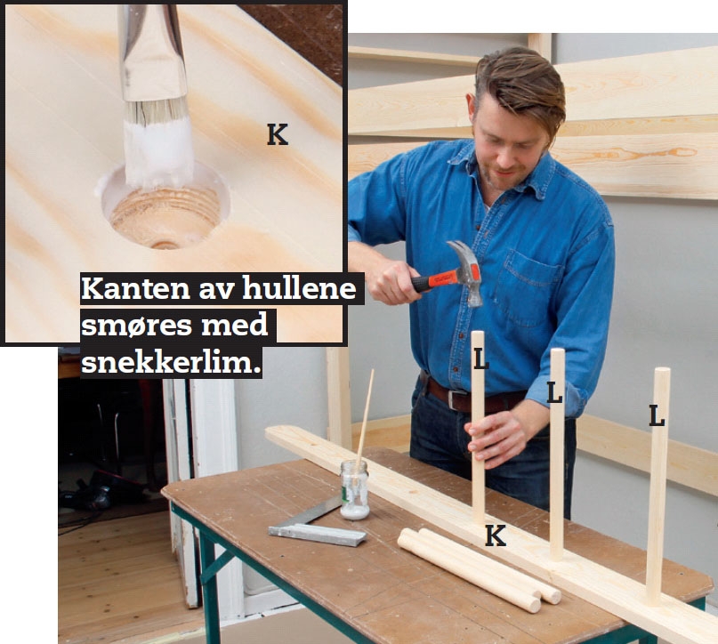 Trinnene (L) slås ned i den ene stige vangen (K). Trinnkantene rundes først med slipepapir, slik at trinnene lettere glir inn. Kanten av hullene smøres med lim, men ikke bunnen, for borets spiss er brutt gjennom. Trinnene rettes opp umiddelbart.