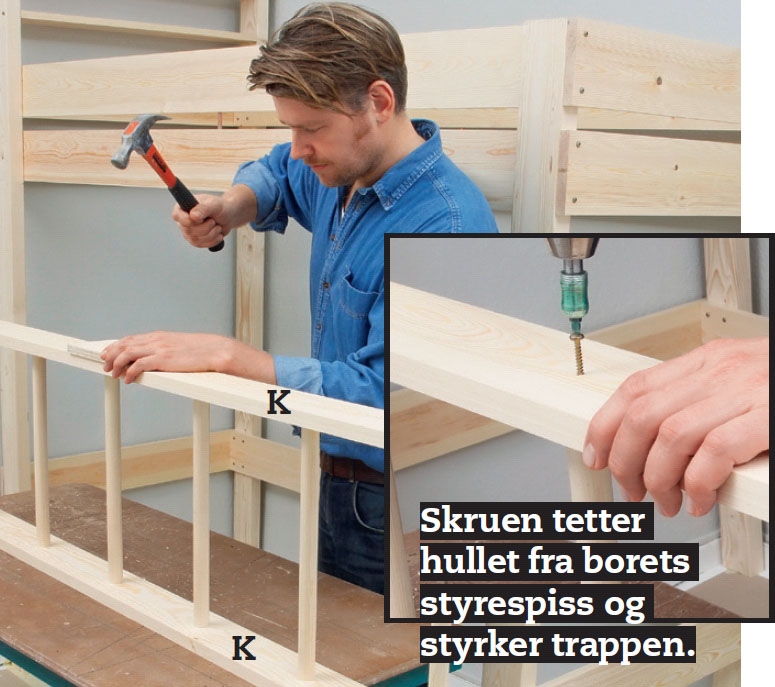 Nå slår du den andre stigevangen på trinnene. Legg lim på kanten av hullene, legg vangen på plass, og bank den på trinnene fra den ene enden. Slå ikke rett på treet, legg en kloss mellom. I alle hullene fra borets spiss settes en 5 x 40 mm skrue.