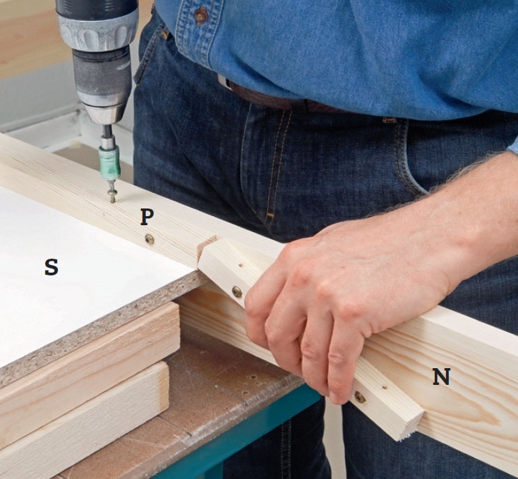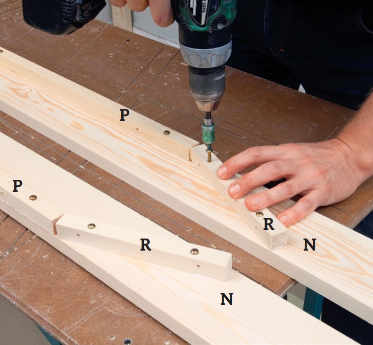 Skliens vanger (N) gjøres klar til glideplatene. Den lange bærelisten (P) festes langs underkanten av sklien med lim og 5 x 40 mm skruer, mens den korte listen (R) vinkles, slik at den går opp til overkanten av vangen.