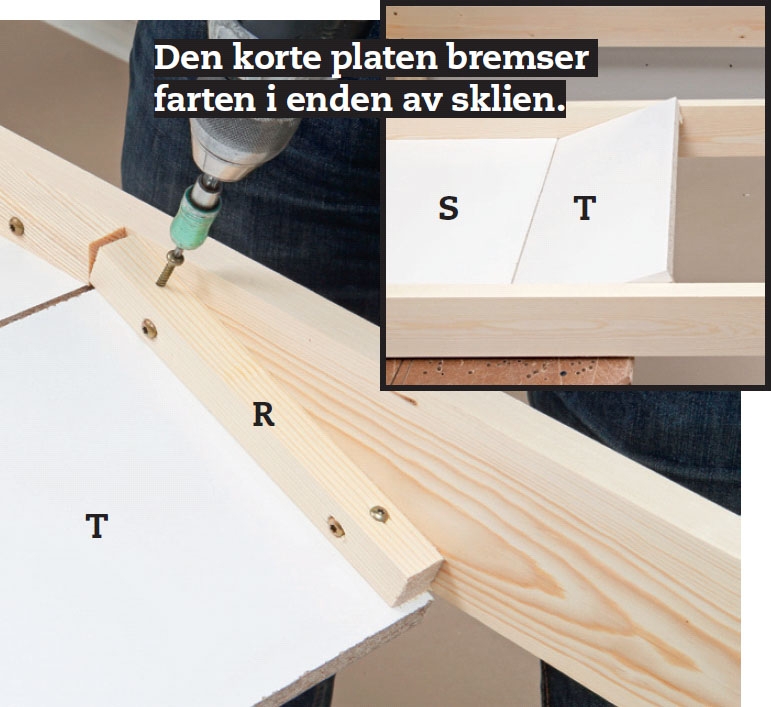 Sidene settes på den lange sklieplaten (S) med lim og 4 x 30 mm skruer. Platen legger du på noen klosser, slik at du kan legge listen an på den når du skrur.