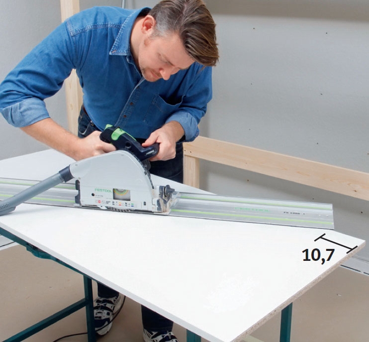 Den hvite platen deles i to med et langt, skrått snitt. Her skjærer vi med en dykksag på skinne, da går det både raskt og nøyaktig, men du kan fint klare jobben med en sirkelsag, som føres langs et fastspent rett bord.
