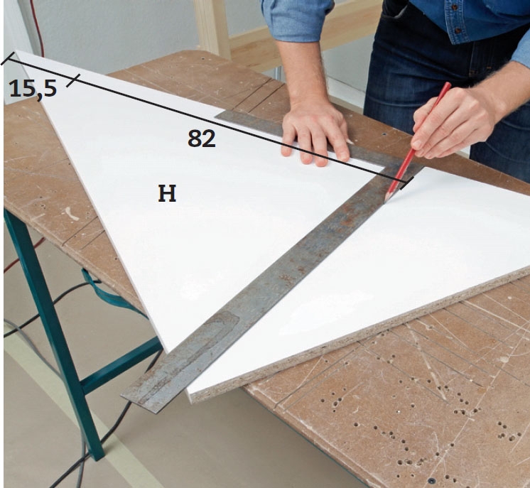 De to bordplatene skjæres ut av en 60 x 125 cm plate av hvit melamin, slik at de vender med den ferdig hvite kanten ut. På tegningen ser du hvordan: Først deles platen i to med et langt, skrått snitt, og deretter måler du først 15,5 cm, så ytterligere 82 cm inn fra de nyskårne kantene til de øvrige rette snittene.