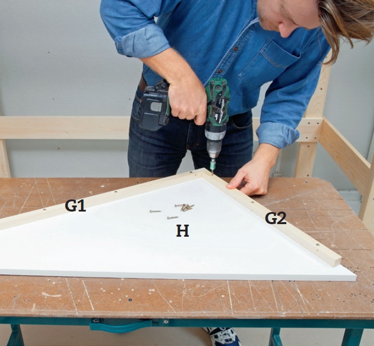 Bærelistene (G1 og G2) festes på bordplatenes underside med lim og 4 x 30 mm skruer. Først de 82 cm lange listene ved de lange kantene som skal vende inn mot gavlene, deretter de korte listene. Husk å snu bordplatene hver sin vei.