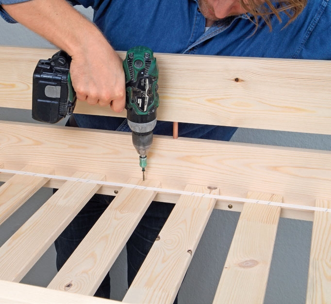 Først legger du lamellbunnen på plass på bunnlistene (F). For å skjule båndene legger du bunnen med båndene opp - vi ser jo bunnen nedenfra. Strekk ut båndene, og skru de to ytterste og den midterste av lamellene fast til listen.