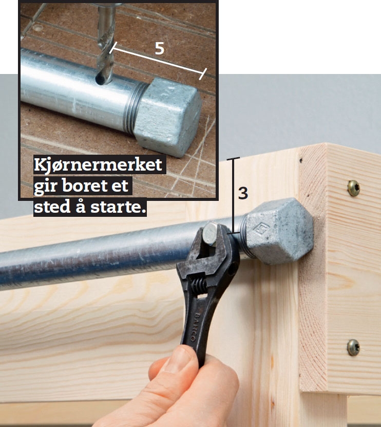 Så skal røret (J) opp. Du begynner med å skru på en endemuffe i begge ender av røret. Mål 5 cm inn fra endene, slå et kjørnermerke, og bor 8,5 mm hull i merkene. Røret festes med 8 x 80 mm franske treskruer 3 cm fra toppen.