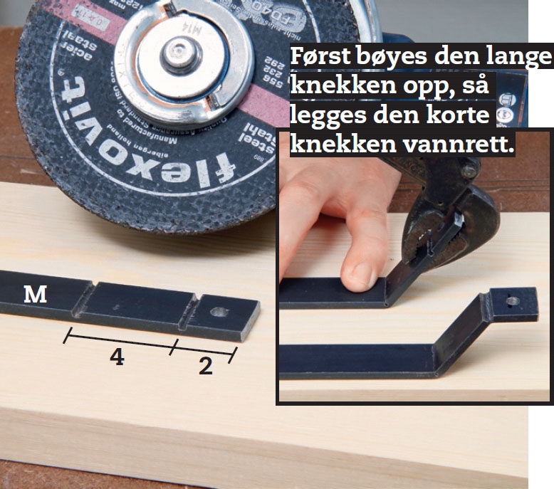 For å oppnå det bygger vi våre helt egne “beslag” av et langt vannrør og fire stykker 4 x 20 mm flatjern. Røret sitter foran det øverste sidebordet, festet på beina, slik at det er en 5 cm bred åpning mellom bord og rør. Inne i den åpningen kommer det på bøyler av flatjern, som vi selv former og setter på baksiden av stigen og sklien - men du kan også velge å få profesjonell hjelp til å forme bøylene.