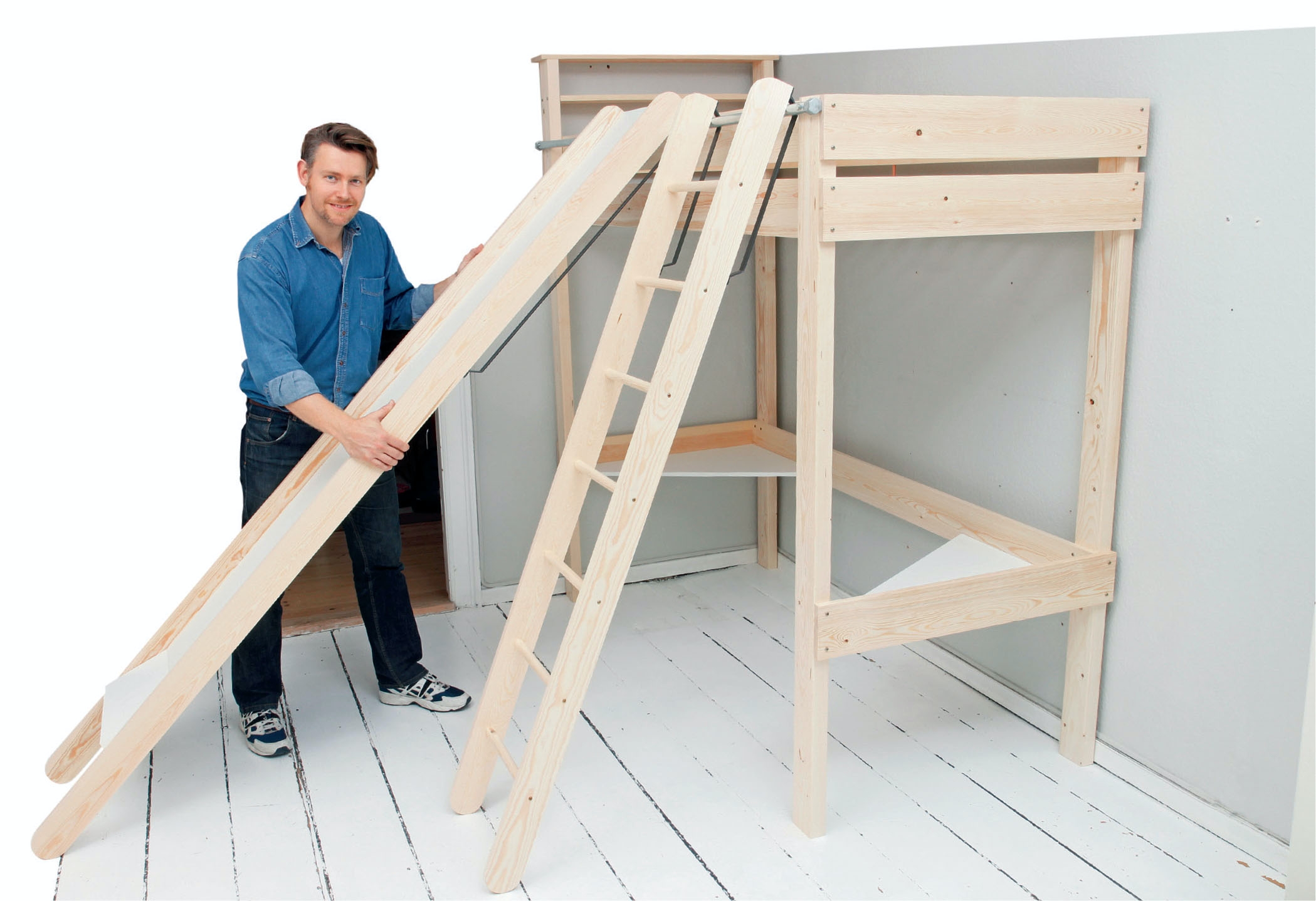 Nå mangler du bare å legge på plass bunnen og å feste sklien og stigen. Eller rettere sagt sikre at de bevarer grepet i sengen, for de sitter ikke mer fast enn at de kan dyttes fra side til side i hele sengens lengde, og kan trekkes ut i skrå posisjon og rettes helt opp til loddrett.