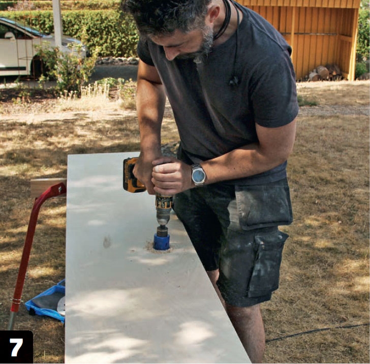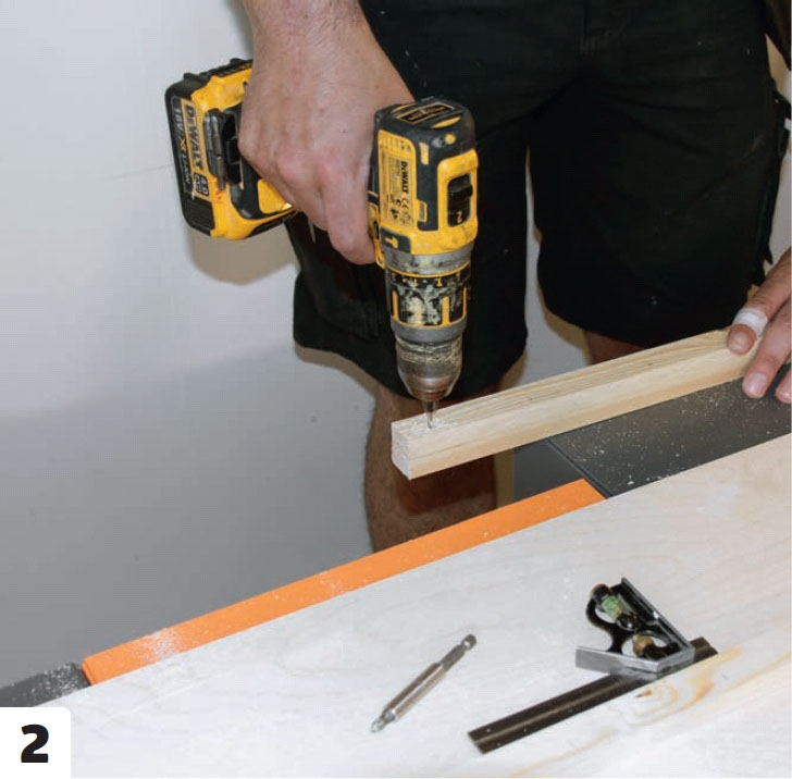 De tynne listene forbores. Vi skal skru fast listene med 4,5 x 60 mm skruer med cirka 10 cm avstand. Vi forborer listene, slik at skruene ikke sprekker opp listene.