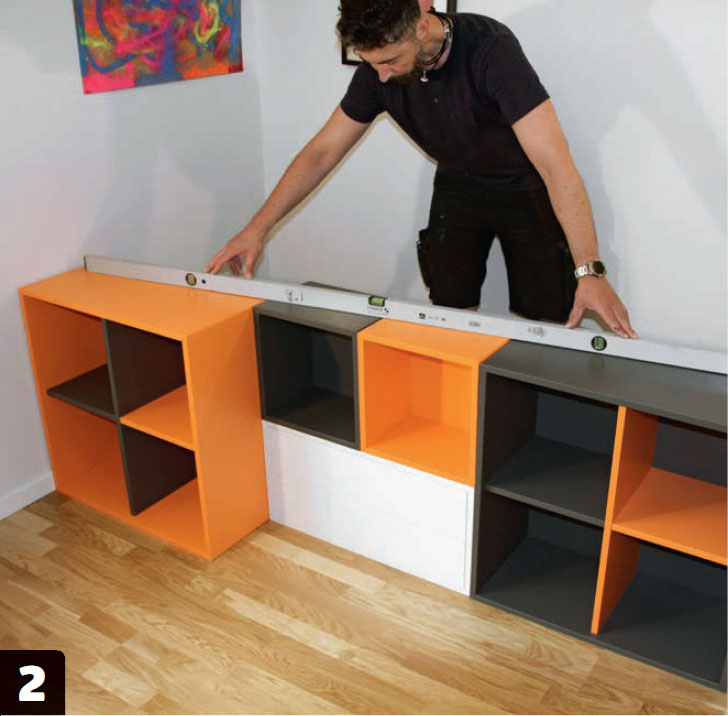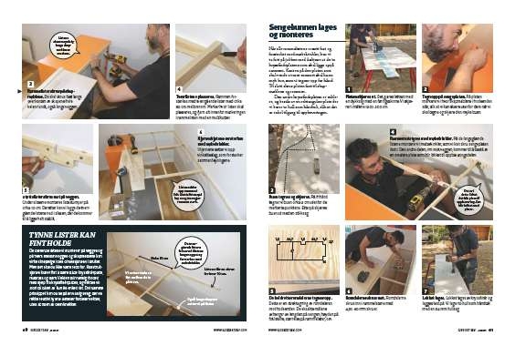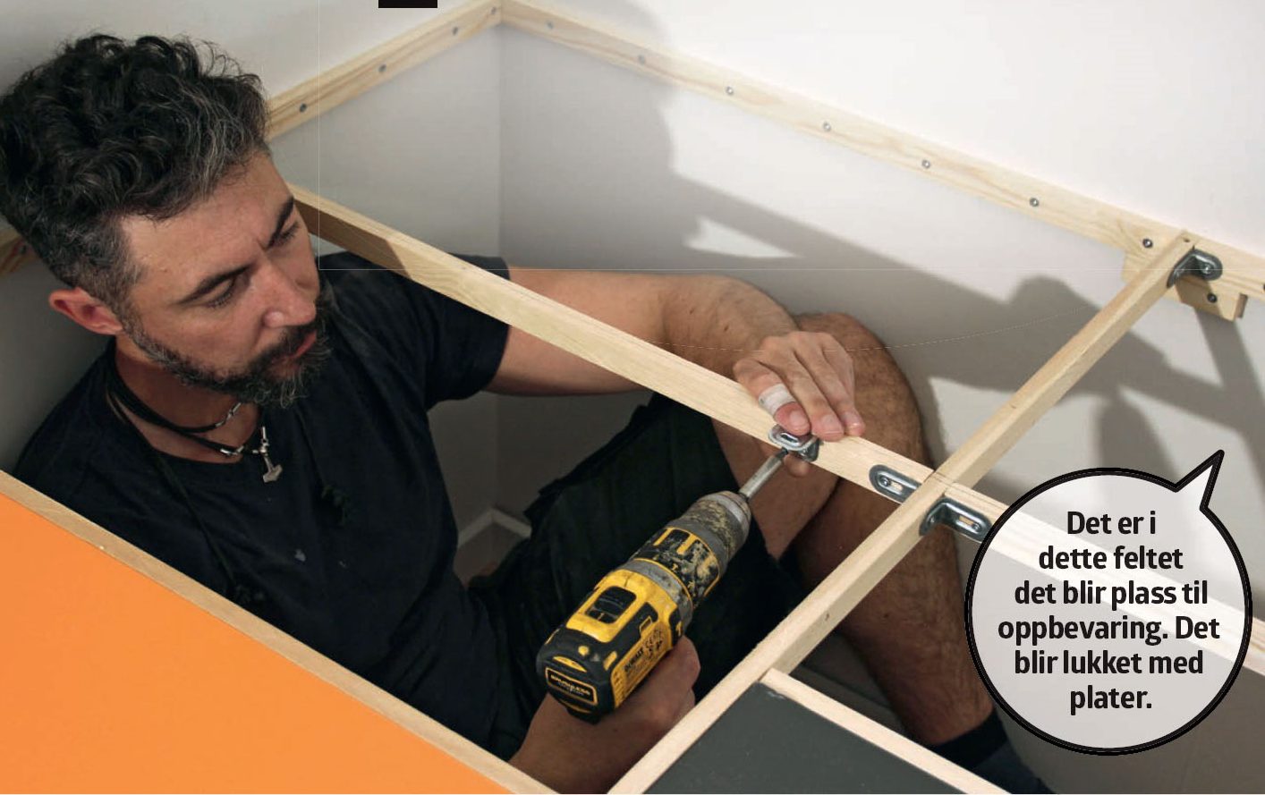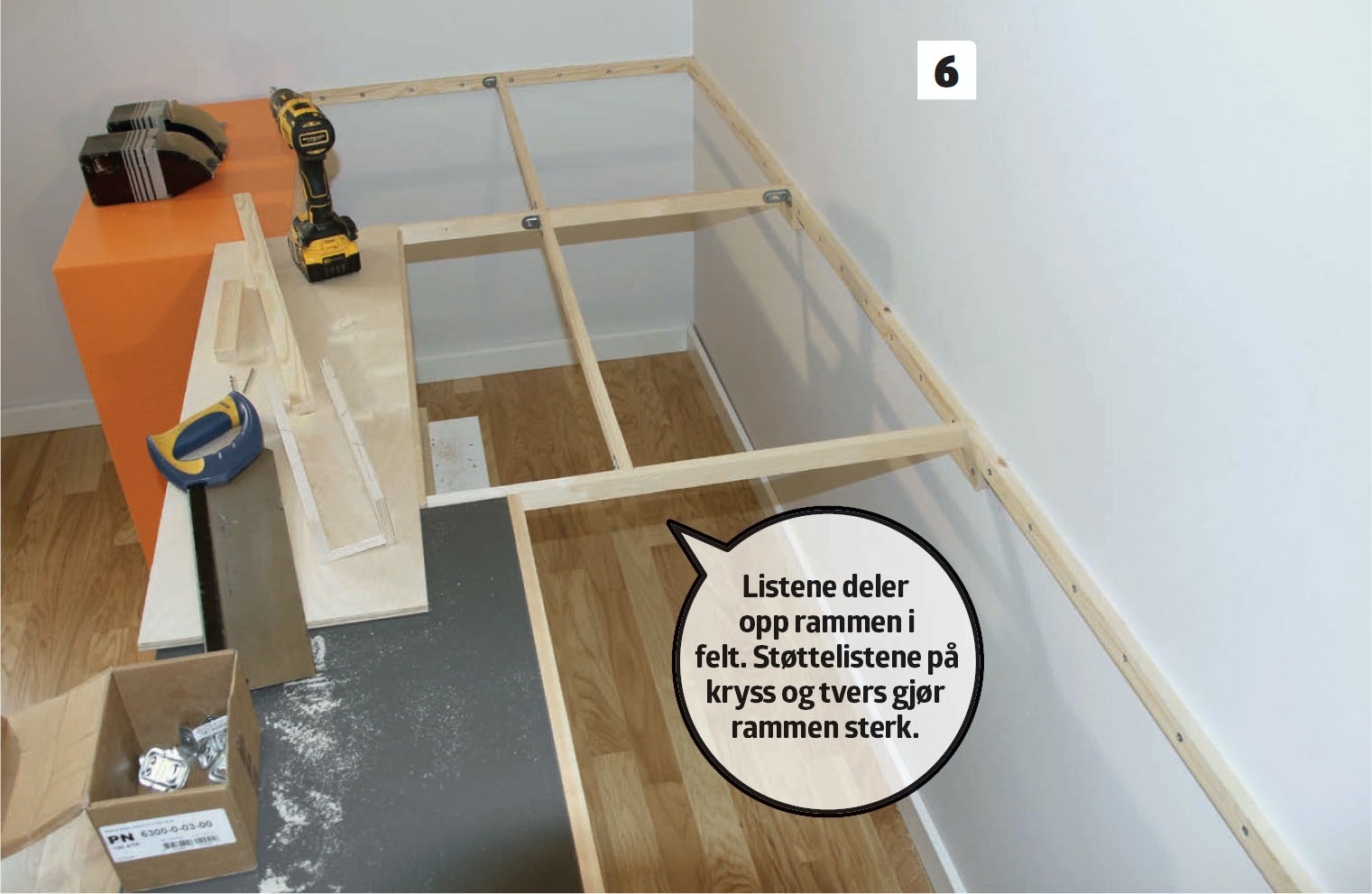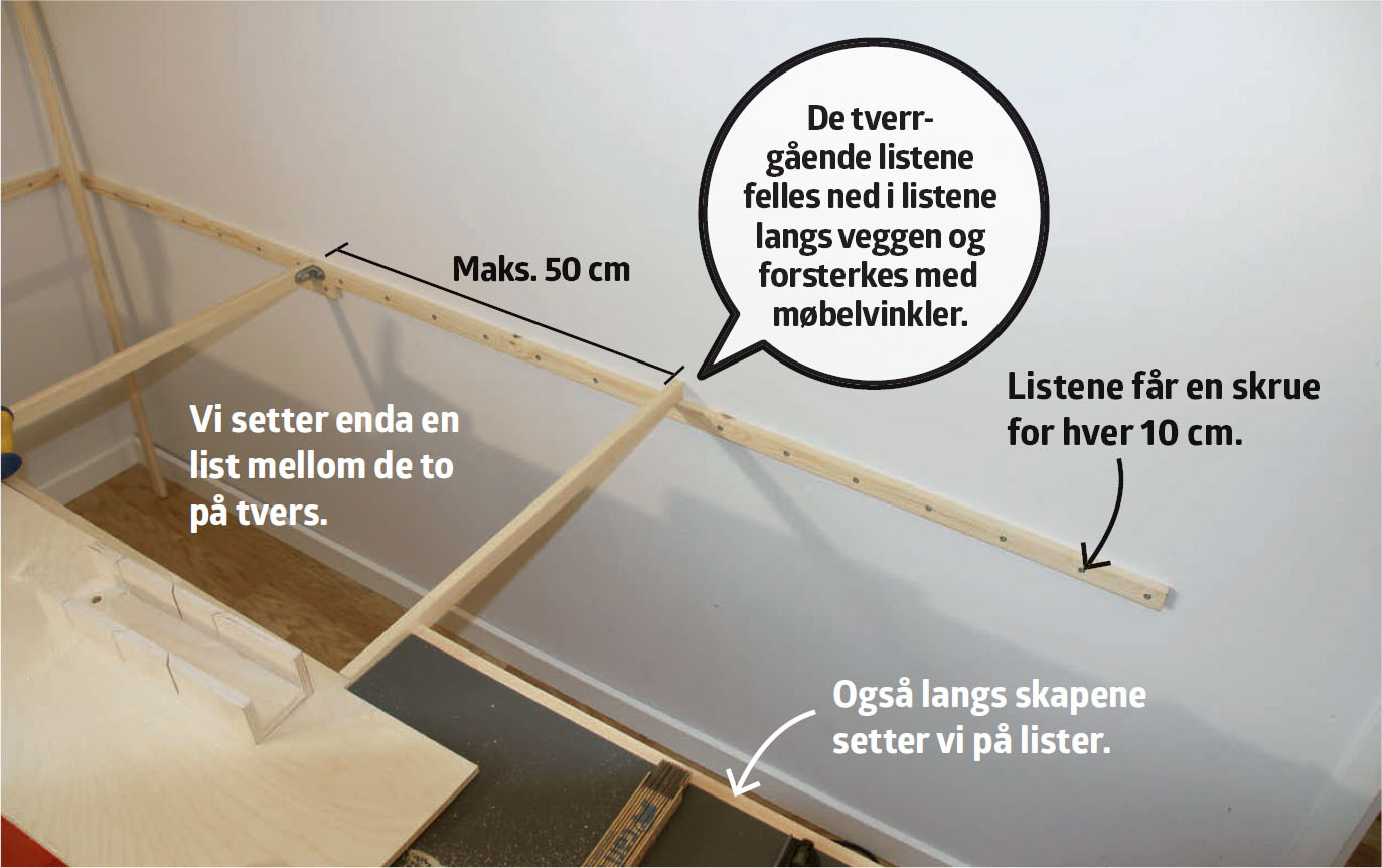 Vi skal sette opp en ramme av lister hele veien rundt på skapmøblene og veggen. Dermed blir skapplattformen og veggen ført sammen, slik at vi får en solid og sterk ramme som fint kan bære både kryssfinérplaten, madrassen og et sovende barn.