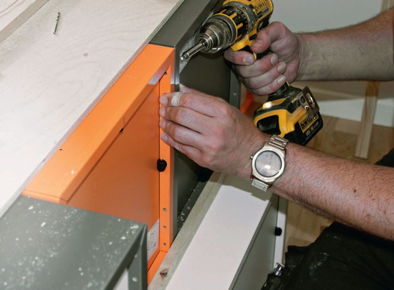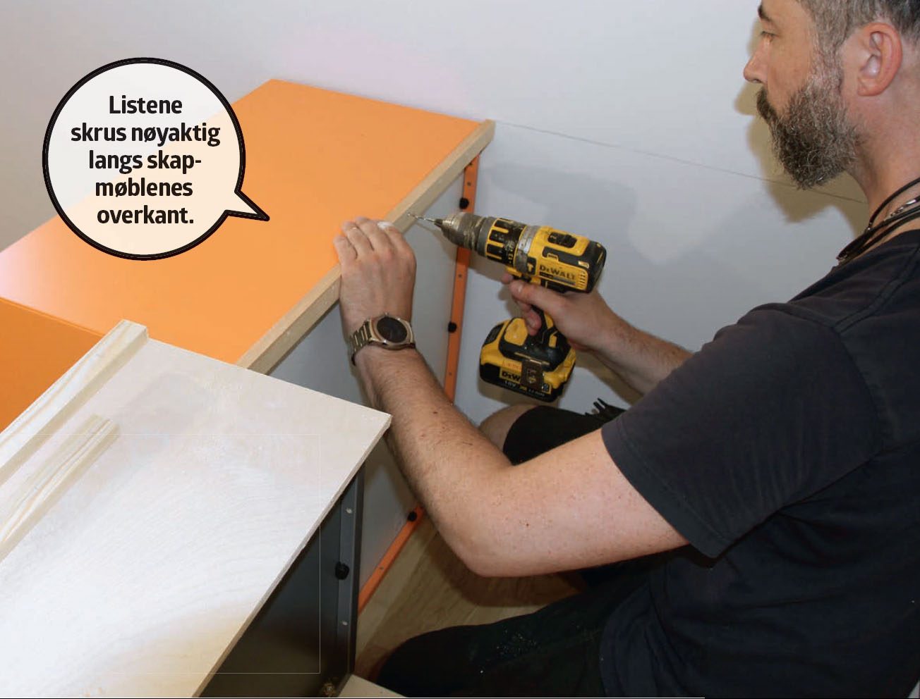 Rammelister skrus på skap møblene. De skal skrus fast langs overkanten av skapene hele veien rundt, også langs veggen.