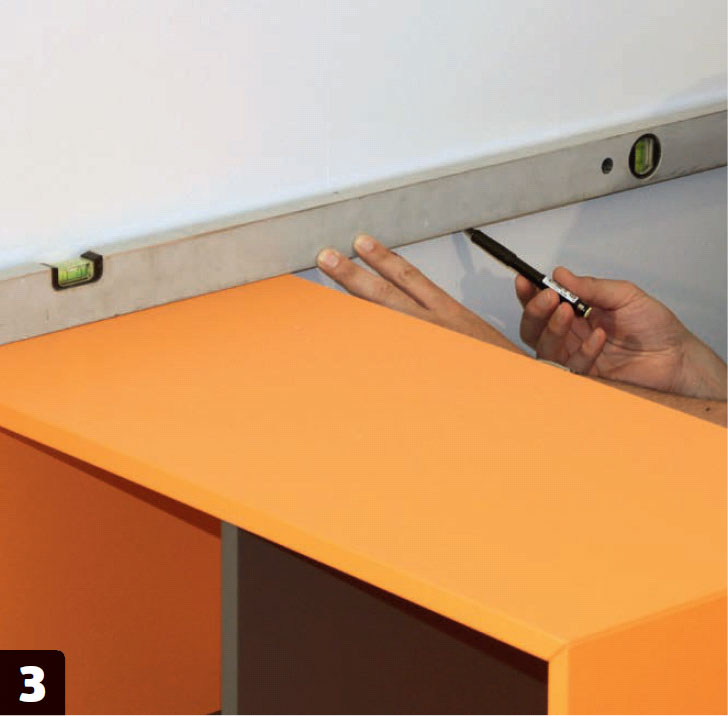 Skapene skal stå i vater. Vi overfører høyden fra overkanten til veggen, slik at vi vet hvor bærelistene skal monteres.