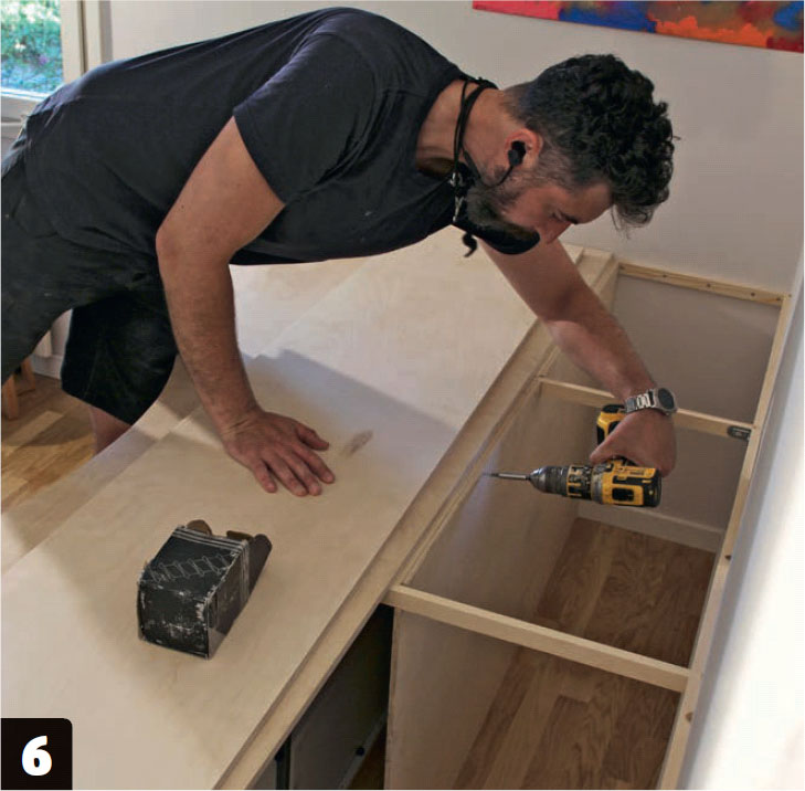 Når alle rammelistene er satt fast og forsterket med møbelvinkler, kan vi ta fatt på jobben med å skjære ut de to kryssfinérplatene som skal ligge oppå rammen. Kanten på den platen som skal vende ut mot rommet skal ha en myk bue, som vi tegner opp for hånd. Til slutt skrus platen fast til skapmøblene og rammen.