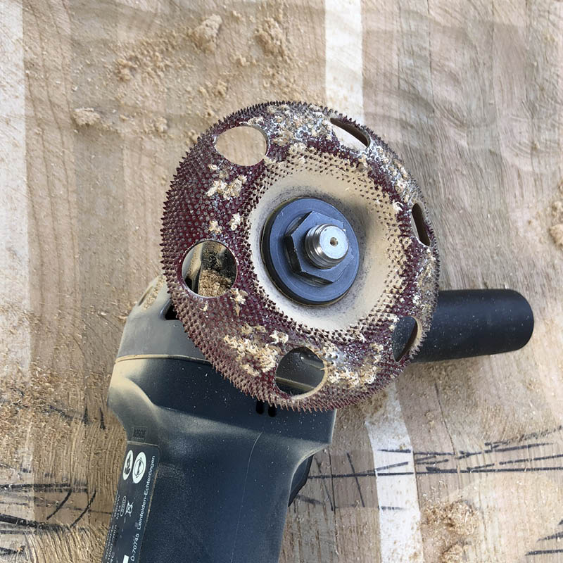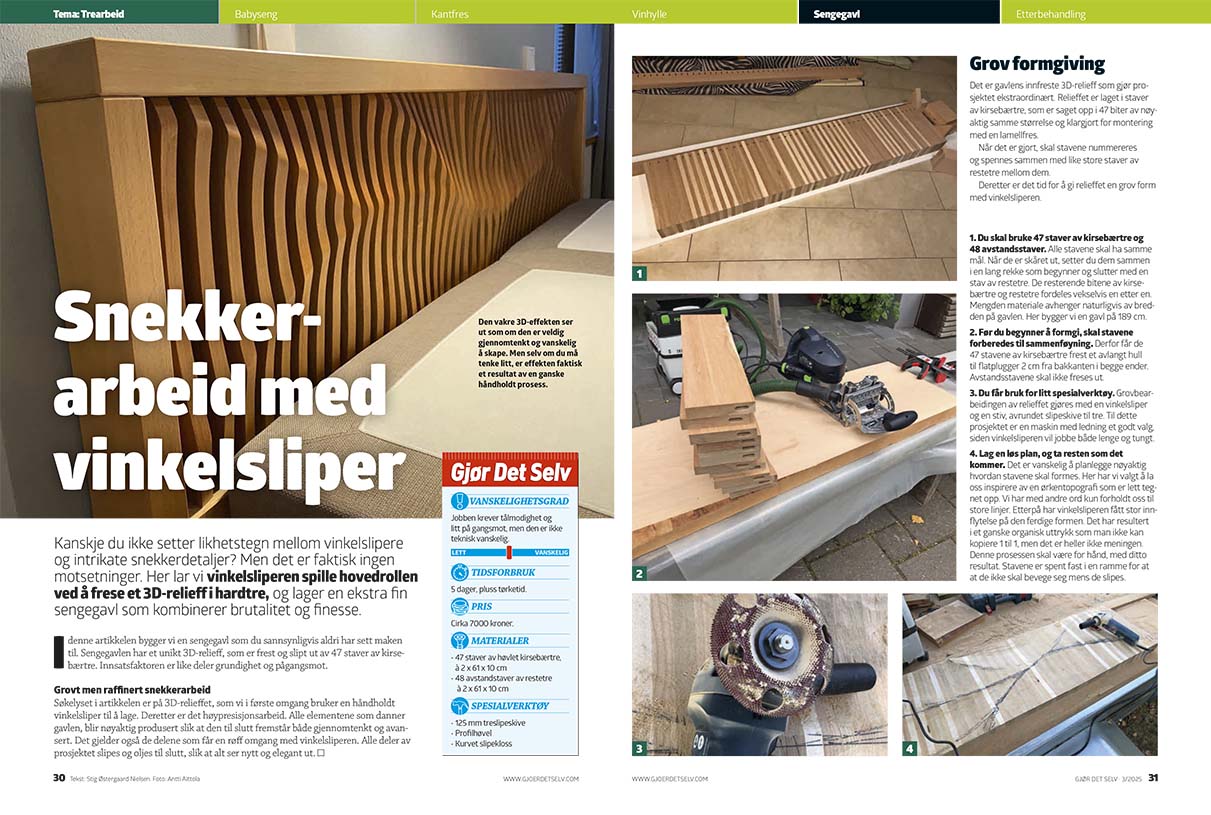 Du får bruk for litt spesialverktøy. Grovbearbeidingen av relieffet gjøres med en vinkelsliper og en stiv, avrundet slipeskive til tre. Til dette prosjektet er en maskin med ledning et godt valg, siden vinkelsliperen vil jobbe både lenge og tungt.