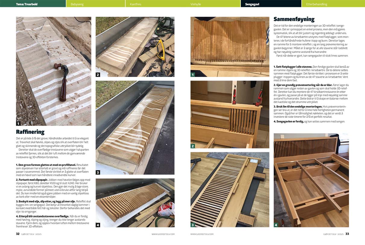 Det er tid for den endelige monteringen av 3D-relieffet i sengegavlen. Det er i prinsippet en enkel prosess, men den må gjøres systematisk, slik at alt blir justert og ingenting ødelagt underveis.