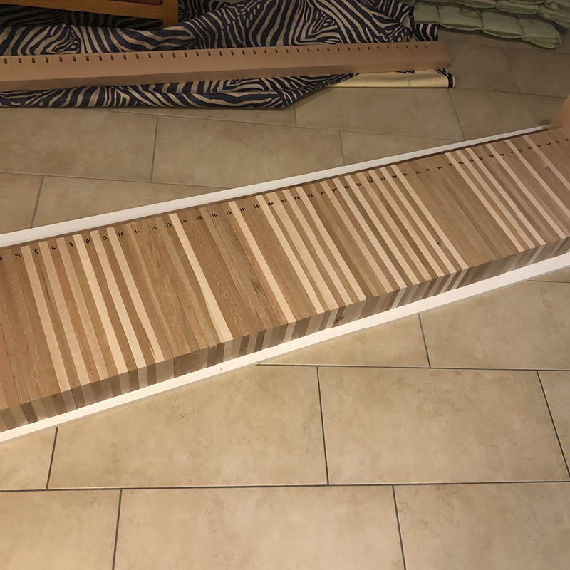 Du skal bruke 47 staver av kirsebærtre og 48 avstandsstaver. Alle stavene skal ha samme mål. Når de er skåret ut, setter du dem sammen i en lang rekke som begynner og slutter med en stav av restetre. De resterende bitene av kirsebærtre og restetre fordeles vekselvis en etter en. Mengden materiale avhenger naturligvis av bredden på gavlen. Her bygger vi en gavl på 189 cm.