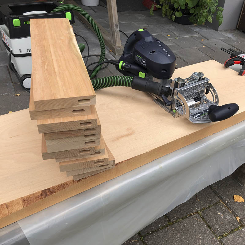 Før du begynner å formgi, skal stavene forberedes til sammenføyning. Derfor får de 47 stavene av kirsebærtre frest et avlangt hull til flatplugger 2 cm fra bakkanten i begge ender. Avstandsstavene skal ikke freses ut.