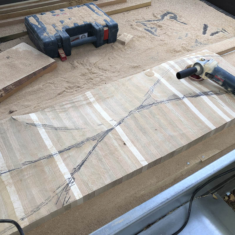 Lag en løs plan, og ta resten som det kommer. Det er vanskelig å planlegge nøyaktig hvordan stavene skal formes. Her har vi valgt å la oss inspirere av en ørkentopografi som er lett tegnet opp. Vi har med andre ord kun forholdt oss til store linjer. Etterpå har vinkelsliperen fått stor innflytelse på den ferdige formen. Det har resultert i et ganske organisk uttrykk som man ikke kan kopiere 1 til 1, men det er heller ikke meningen. Denne prosessen skal være for hånd, med ditto resultat. Stavene er spent fast i en ramme for at at de ikke skal bevege seg mens de slipes.