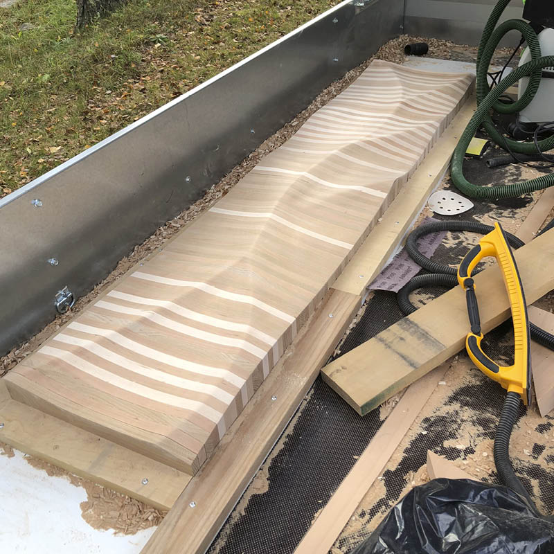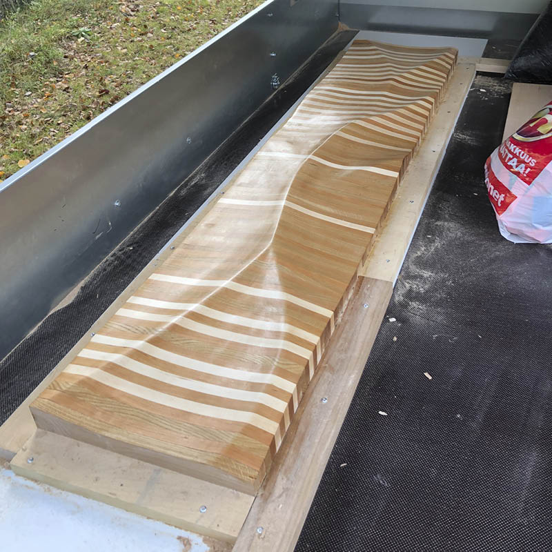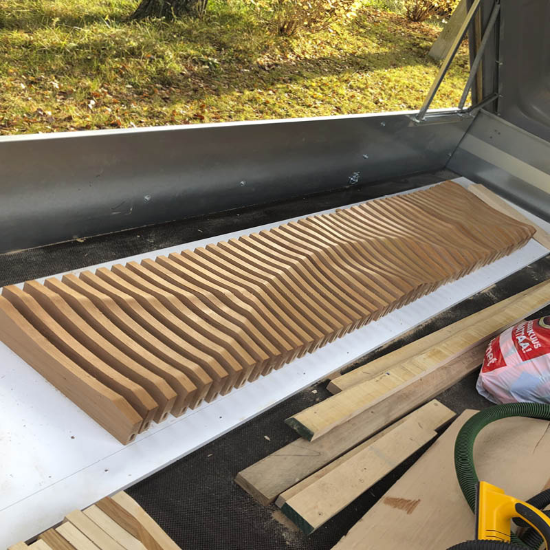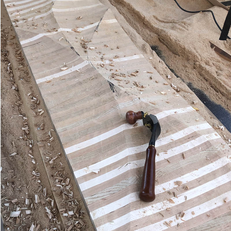 Det er på tide å få det grove, håndholdte arbeidet til å se elegant ut. Treverket skal høvles, slipes og oljes slik at overflaten blir helt glatt og skinnende og det topografiske uttrykket blir tydelig.