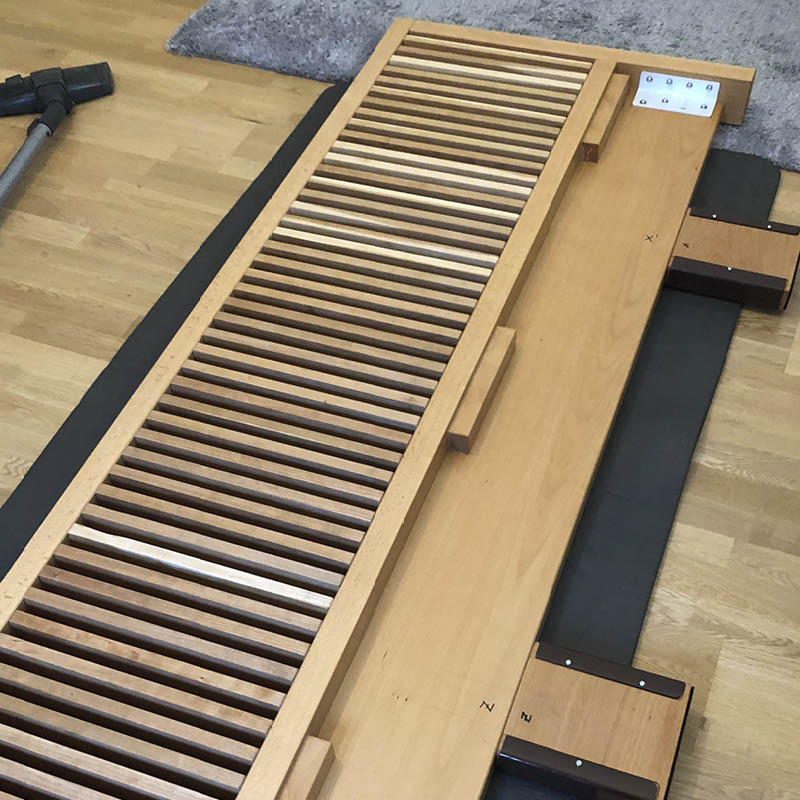 Gjør en grundig prøvemontering når du er klar. Først lager du rammen som utgjør resten av gavlen og som skal holde 3D-relieffet. Deretter kan du montere de 47 kirsebærtrestavene én etter én i gavlen, og passe på at de ligger på linje med nøyaktig samme avstand fra hverandre. Dette bidrar til å skape en balanse mellom det kaotiske og det stramme uttrykket.